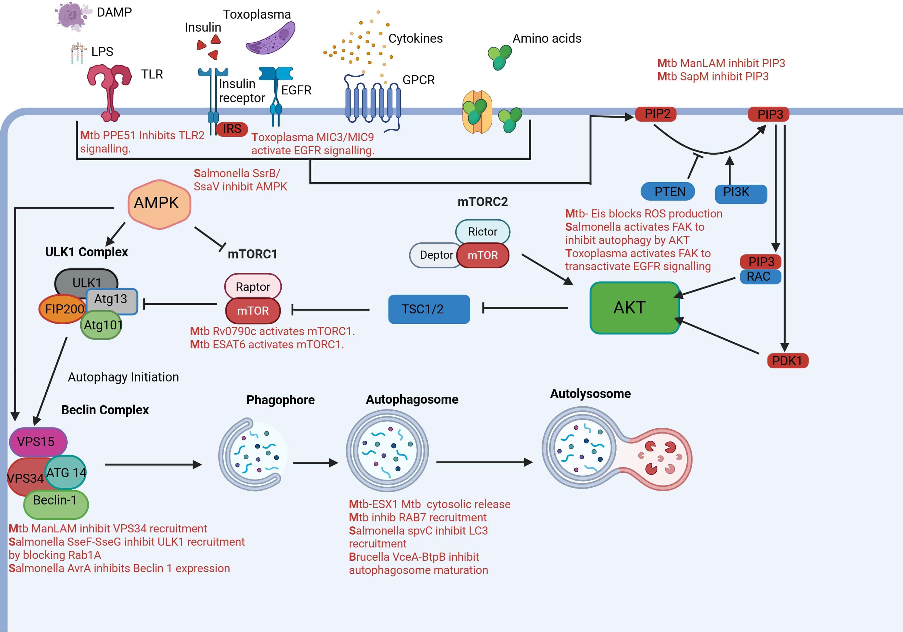 Figure 2. AKT activation in macrophages can be activated by PIP3 and PDK1 in response to extracellular stimuli like amino acids, growth factors, cytokines, LPS, DAMPS and Toxoplasma gondii microneme proteins. Once activated AKT inhibits autophagy by inhibiting mTORC1 complex. AKT itself is regulated by mTORC2. AMPK also controls autophagy by sensing nutrients and inhibiting or activating mTORC1.Autophagosome formation is initiated by the ULK1 complex and then BECLIN-1 complex leads to formation of autophagosome which finally fuses with lysosomes to digest intracellular pathogens. Pathogens have acquired several strategies to manipulate this pathway inside of macrophages to aid in their survival. Created in BioRender. Shoeran, et al. (2025) https://BioRender.com/v11t1nw.