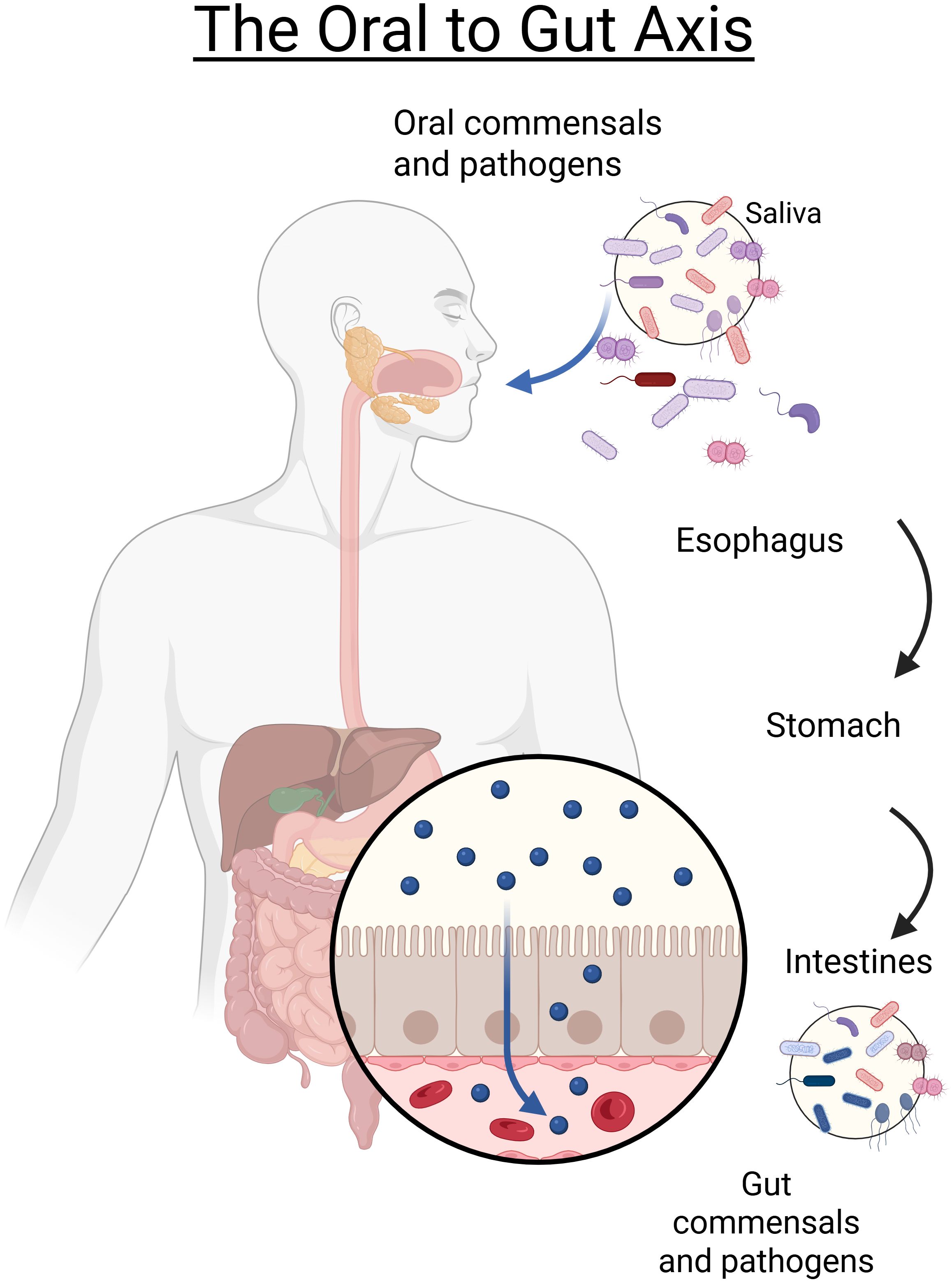 The intersection of the oral and gut microbiomes is an under researched area despite their link at the start of the digestive track through the end of the digestion (Figure 1), though, several clinical studies have examined this connection in specific patient populations. Foundational work has demonstrated that oral microbes can translocate and establish within the gut environment, with implications for both microbial community structure and host metabolism. For example, Schmidt et al. showed extensive transmission of oral taxa to the gut across diverse human cohorts, supporting the concept of an oral–gut microbial axis (Schmidt et al., 2019). In fact, the authors of this work developed a list of strain level taxa that were reported to be ‘transmitter’ taxa between the oral and gut microbiota (Schmidt et al., 2019). In murine models, oral administration of Porphyromonas gingivalis altered both gut microbial composition and the host serum metabolome, providing mechanistic evidence of how oral dysbiosis can impact gut and systemic physiology (Kato et al., 2018). More recently, integrated microbiome–metabolome studies have further linked oral dysbiosis with downstream gut microbial and metabolic shifts in human populations, including those with periodontitis (Dong et al., 2022; Cheng et al., 2024). These studies collectively establish a foundation for considering the oral and gut microbiomes as interconnected ecosystems whose disruption may exacerbate disease processes.