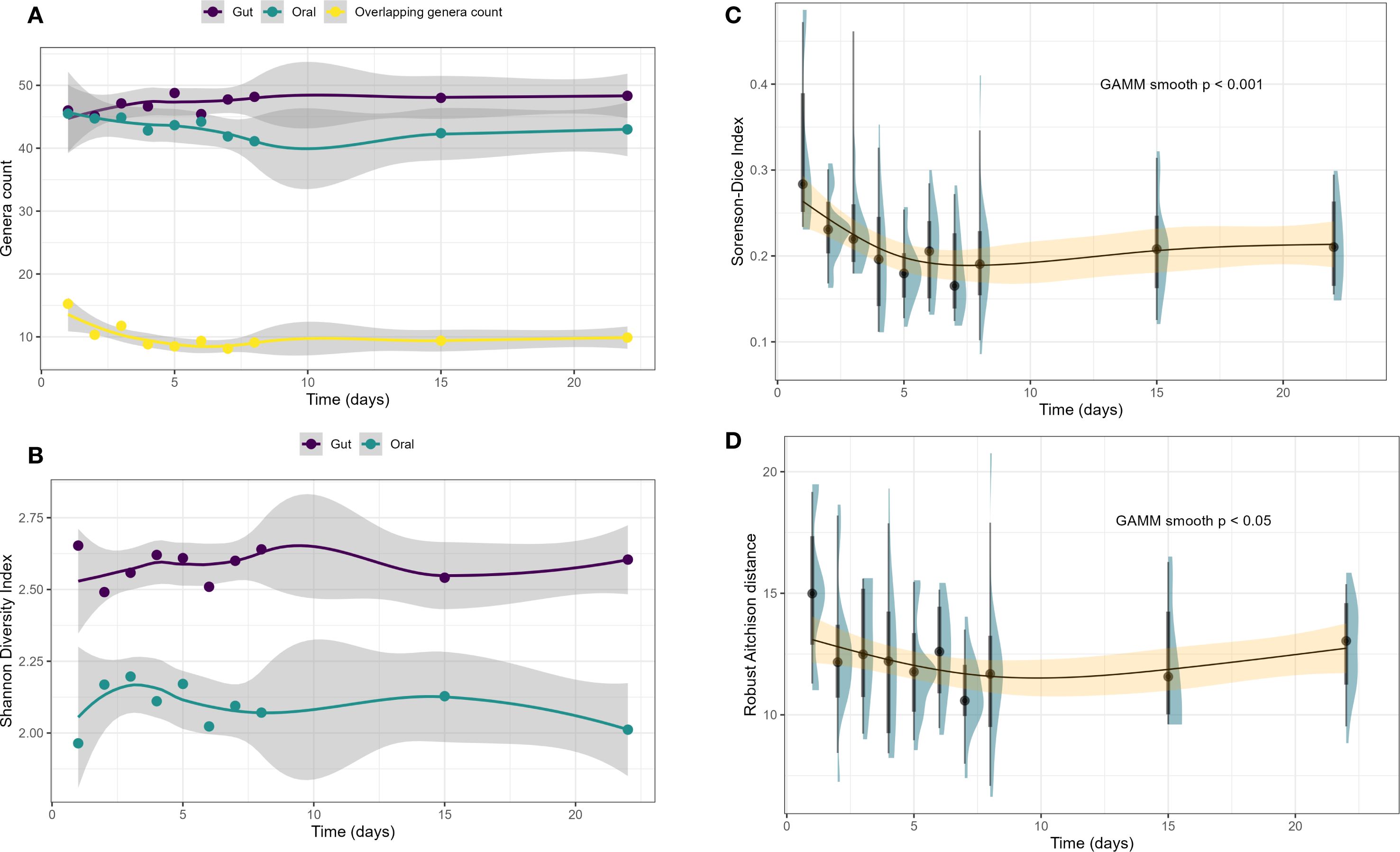 Figure 2. Temporal shift in oral–gut microbiome overlap and shared genus compositional structure. (A) Number of genera in the oral (teal) and gut (purple) microbiomes over time, along with the number of overlapping genera shared between both sites (yellow). (B) Shannon Diversity Index for oral and gut microbiomes over time, showing consistently higher alpha diversity in the gut across all timepoints. (C) Sorenson-Dice Index, a measure of genus-level similarity between oral and gut samples, significantly decreased over time (GAMM p < 0.001), with the most rapid decline during the first week, indicating reduced oral–gut overlap. (D) Robust Aitchison distance, representing compositional dissimilarity among shared genera, also declined over time (GAMM p < 0.05), suggesting increasing similarity in the structure of shared taxa despite overall reduced overlap. Shaded regions in (A, B) are standard errors of the smoothing technique (LOESS) applied to the point estimates shown; shaded regions in (C, D) and represent 95% confidence intervals around smoothed GAMM trend lines.