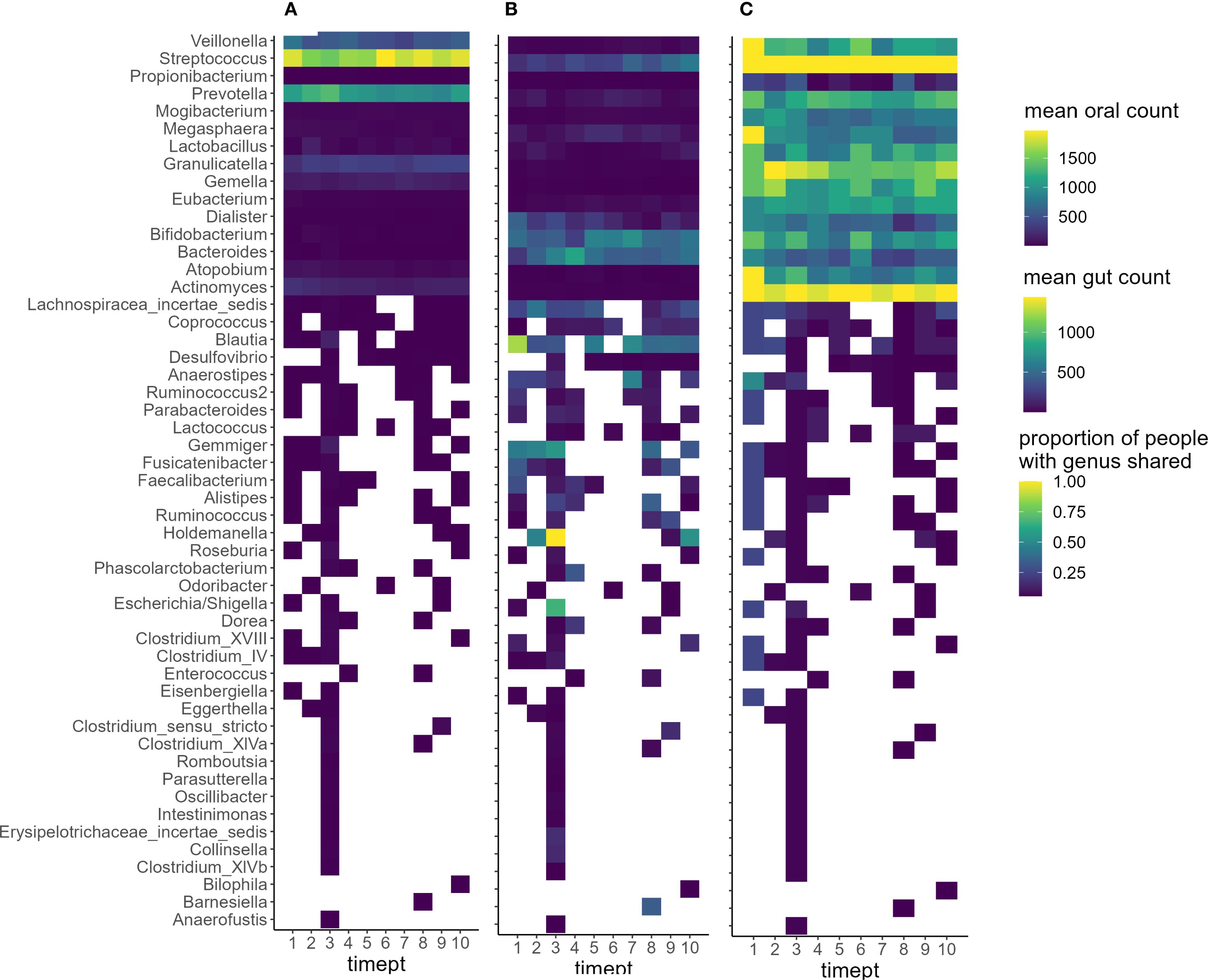 Figure 3. Shared genus level counts in oral and gut microbiome and the proportion of shared genera across individuals during inpatient treatment. Legend: Shared genera across all timepoints and limited to genera co-occurring at any timepoint. (A) Oral microbiome genus-level counts across ten timepoints. (B) Gut microbiome genus-level counts across ten timepoints. Color intensity indicates abundance (count values). (C) Proportion of participants sharing each genus in both oral and gut samples at each timepoint. Brighter colors (yellow) indicate genera shared by a larger proportion of individuals.