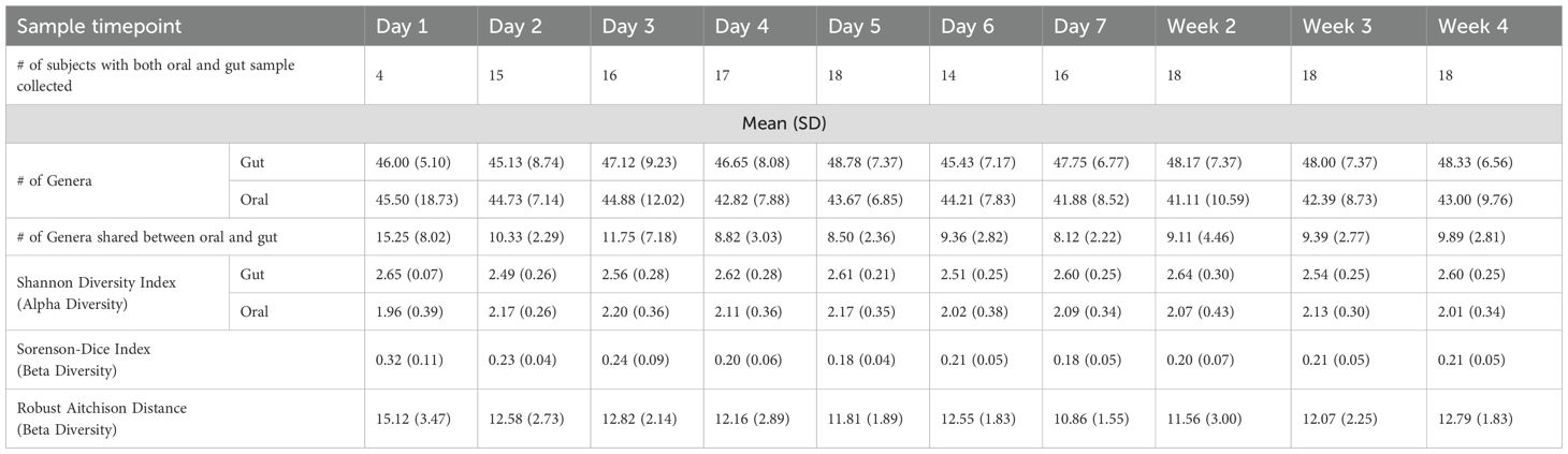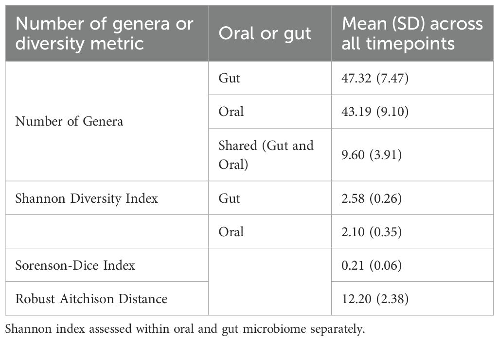 The average number of genera detected across all samples was 47.32 ± 7.47 for the gut and 43.19 ± 9.10 for the oral microbiome (Figure 2A). On average, 9.60 ± 3.91 genera were shared between the oral and gut microbiomes across timepoints. Alpha diversity, as measured by the Shannon Diversity Index, was higher in the gut (2.58 ± 0.26; range: 2.49–2.65) than in the oral microbiome (2.10 ± 0.35; range:1.96–2.20) across all samples (Figure 2B, Table 1) and when comparing the average over all timepoints, a significance average SDI between oral and gut was observed (p<.001) (Supplementary Table 3). Beta diversity measuring similarity (overlap) between the paired oral and gut samples was 0.21 ± 0.06 (Sorenson-Dice Index) which indicated a relatively low overlap. The average compositional distance within individuals between the two sites (Robust Aitchison Distance) was 12.20 ± 2.38.