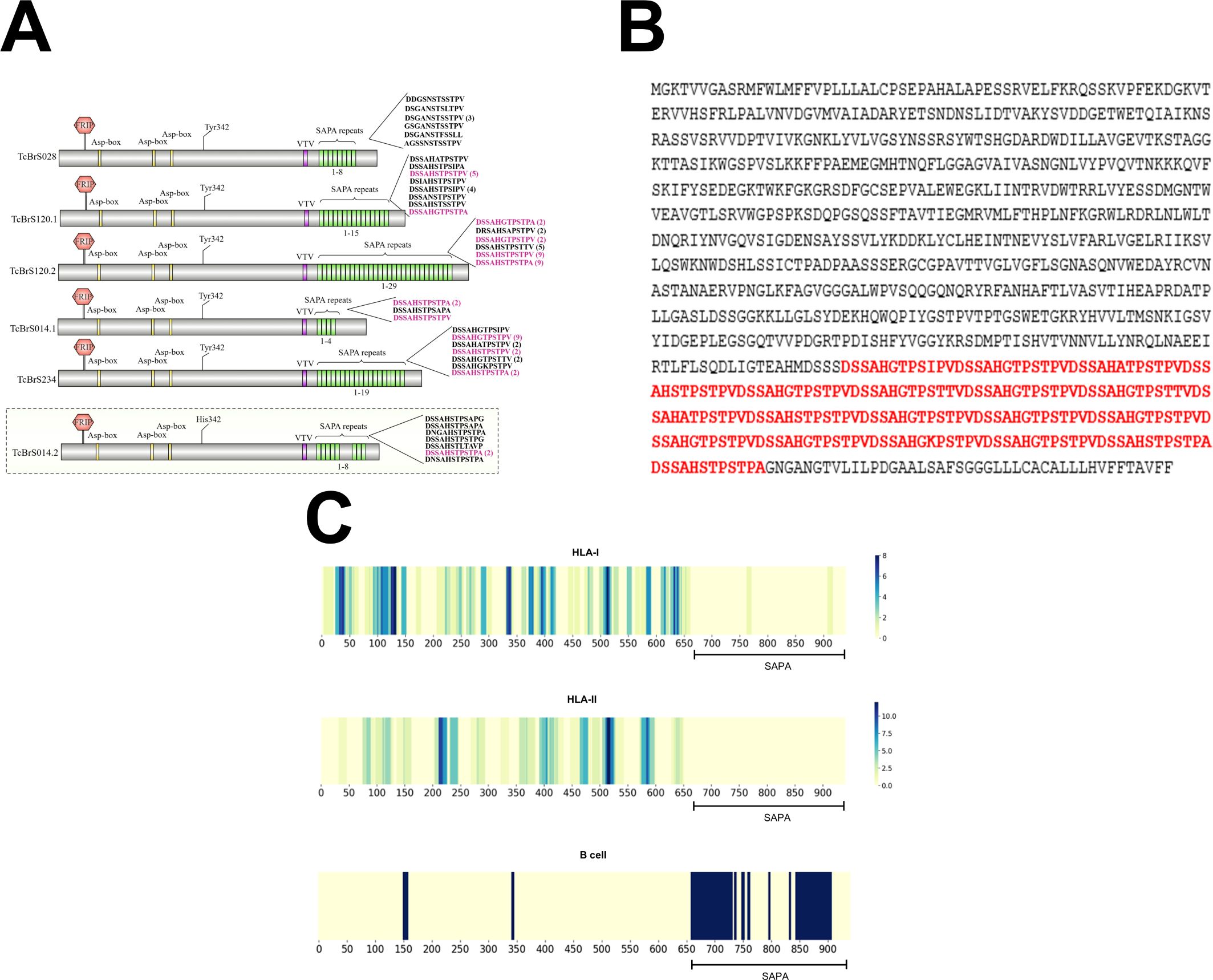 Figure 1. Sequence analysis of active trans-sialidases and in silico epitope prediction. (A) Analysis of SAPA repeats in the trans-sialidases from the T. cruzi CL Brener strain. (B) Amino acid sequence of an active trans-sialidase containing SAPA repeats, highlighted in red. (C) Predicted CD8+ T cell (HLA class I), CD4+ T cell (HLA class II), and B cell epitopes in an active trans-sialidase containing SAPA repeats, identified through in silico epitope prediction.