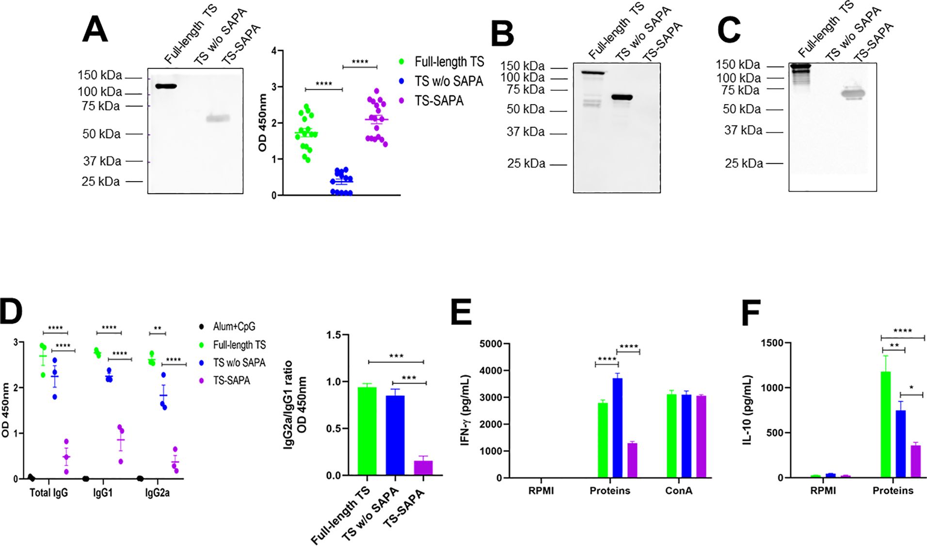 Figure 3. Humoral and cellular immune responses in mice immunized with different versions of recombinant TS. BALB/c mice were immunized with 10 µg of recombinant TS proteins formulated with alum and CpG adjuvants, using a prime-boost-boost protocol. Thirty days after the last immunization, sera were collected for western blot and for quantification of total IgG, IgG1, and IgG2a levels by ELISA. Spleens were also harvested for splenocyte culture and cytokine quantification. (A) Western blot (left) and ELISA (right) using serum from mice immunized with full-length TS against the different recombinant TS, demonstrating preferential antibody recognition of SAPA repeats over the catalytic domain. ****P < 0.0001. (B, C) Western blot using serum from mice immunized with TS without SAPA (B) and TS-SAPA (C), tested against the different recombinant TS. (D) ELISA showing total IgG, IgG1, and IgG2a levels in serum from mice immunized with recombinant protein coated on the surface of a 96-well plate (left) and the IgG2a/IgG1 ratio (right). **P < 0.01, ***P < 0.001, ****P < 0.0001. (E, F) Quantification of IFN-γ (E) and IL-10 (F) in supernatants of splenocyte cultures incubated for 72h with RPMI medium (negative control), stimulated with the respective recombinant TS, or concanavalin A (ConA, positive control). *P < 0.05, **P < 0.01, ****P < 0.0001.