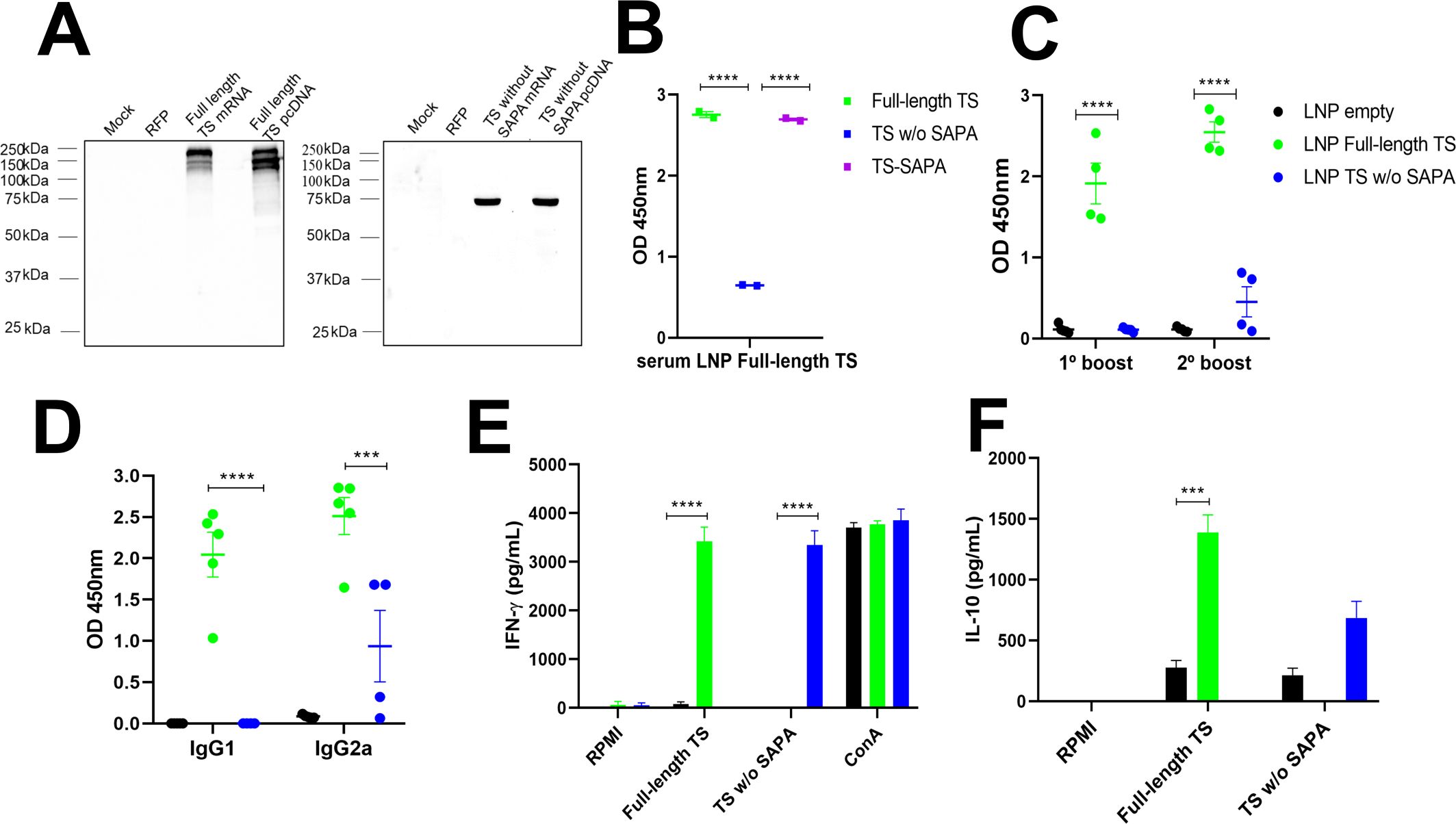 Figure 5. Humoral and cellular responses in mice immunized with RNA encoding TS with or without SAPA. RNA corresponding to the sequences of full-length TS and TS without SAPA repeats was transcribed in vitro and used in the immunization protocol. Empty LNPs were used as a control. (A) To assess RNA expression, HeLa cells were transfected using lipofectamine and protein expression was confirmed by Western blot using antisera from mice immunized with full-length TS (left) or TS without SAPA (right). Negative controls (Mock and Red Fluorescent Protein - RFP) and a positive control (pcDNA encoding both proteins) are shown in the Western blot. After confirming expression, RNAs were encapsulated into LNPs for use in immunization protocol. Female BALB/c mice were immunized with 10 µg of LNP-formulated RNA following a prime-boost-boost protocol as previously described. (B) Immunodominance of SAPA repeats was also observed with RNA formulations. ELISA was performed with serum from mice immunized with LNPs containing full-length TS RNA, which was tested against all three recombinant TS versions. Similar to protein immunization, RNA formulations induced preferential antibody recognition of SAPA repeats over the catalytic domain. ****P < 0.0001. (C) Serum was collected after the first and second boosts, and total IgG levels were measured by ELISA using the corresponding recombinant protein for plate coating. ****P < 0.0001. (D) IgG1 and IgG2a subclass levels in serum from mice immunized with TS RNA formulations were determined by ELISA. ***P < 0.001, ****P < 0.0001. (E, F) IFN-γ (E) and IL-10 (F) levels were quantified in supernatants from splenocyte cultures incubated with RPMI medium (negative control), stimulated for 72 h with the respective recombinant TS, or concanavalin A (ConA, positive control). ***P < 0.001, ****P < 0.0001.
