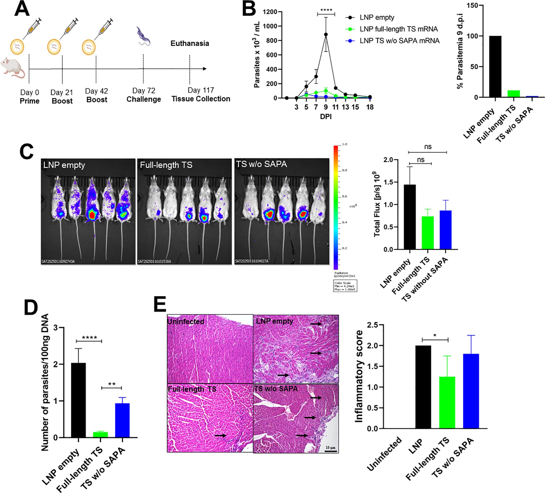 Figure 6. Evaluation of protection from TS RNA immunization following challenge with the T. cruzi Y strain. (A) Female BALB/c mice were immunized with LNP formulations containing 10 µg of Full-length TS RNA or TS without SAPA RNA using a prime-boost-boost protocol. Thirty days after the last immunization, mice were challenged with 104 bloodstream trypomastigotes of the T. cruzi Y strain expressing luciferase. (B) Parasitemia in immunized and challenged mice was followed for 18 days (left). The peak of parasitemia was reached at 9 days post-infection (DPI) and presented as a bar graph (right). ****P < 0.0001. (C) Tissue parasitism was assessed by bioluminescence using an In Vivo Imaging System (IVIS) to visualize luciferase activity from T. cruzi in the mice. Bioluminescence quantification is shown on the right. (D) qPCR in heart tissue from immunized and challenged animals after 45 DPI. **P < 0.01, ****P < 0.0001. (E) Histological analysis of heart tissue showing inflammatory infiltrates (arrows); inflammatory scores are shown in the bar graph (right). *P < 0.05. Scale bar = 10 μm. 20X objective.