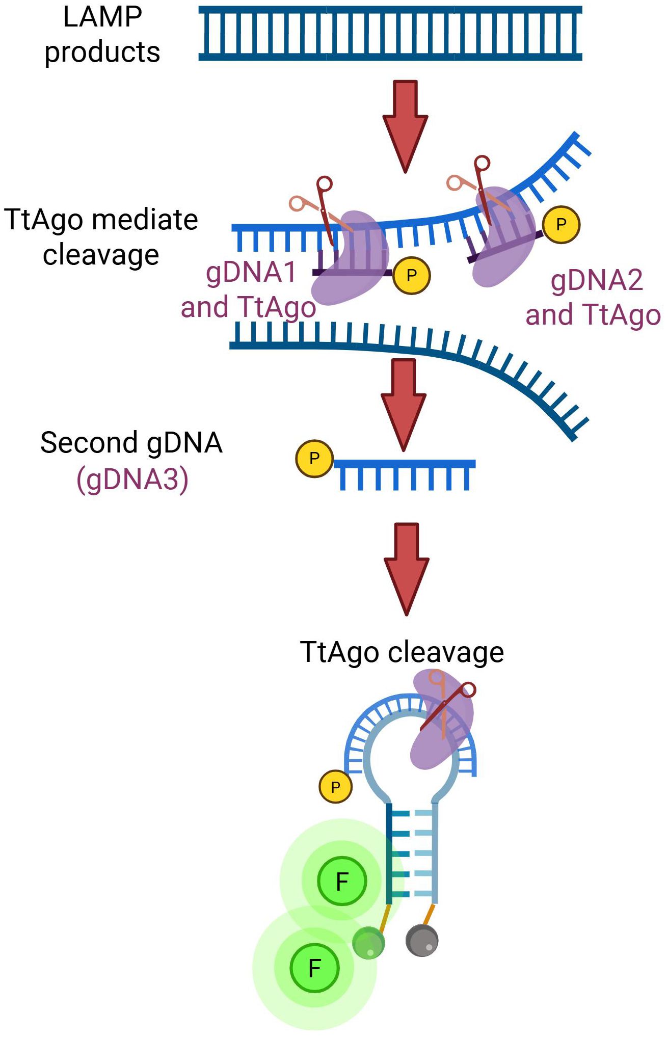 Phosphorylated DNA guides (gDNA1 and gDNA2) program TtAgo to bind and cleave the LAMP products at defined positions, releasing a short single-stranded DNA fragment. This fragment subsequently acts as a secondary guide (gDNA3), to direct TtAgo to the molecular beacon. Cleavage of the probe disrupts its stem–loop structure and separates the fluorophore from the quencher, resulting in a robust fluorescence signal.