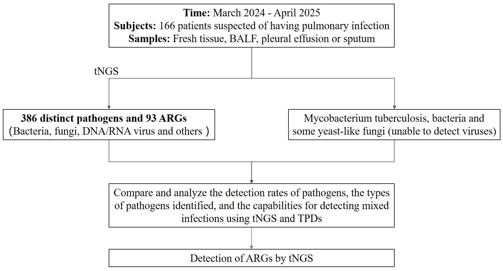 A prospective study was conducted from March 2024 to April 2025 to evaluate the diagnostic efficacy of tNGS in patients suspected pulmonary infections. A total of 166 patients presenting with clinical signs and symptoms indicative of pulmonary infections were enrolled in this study. Each participant underwent both tNGS and TPDs for parallel diagnostic comparison. This study was approval by the Ethics Committee of the Xinjiang Uygur Autonomous Region Sixth People’s Hospital (Approval ID: 2025-051). The layout of this study is depicted in Figure 1.