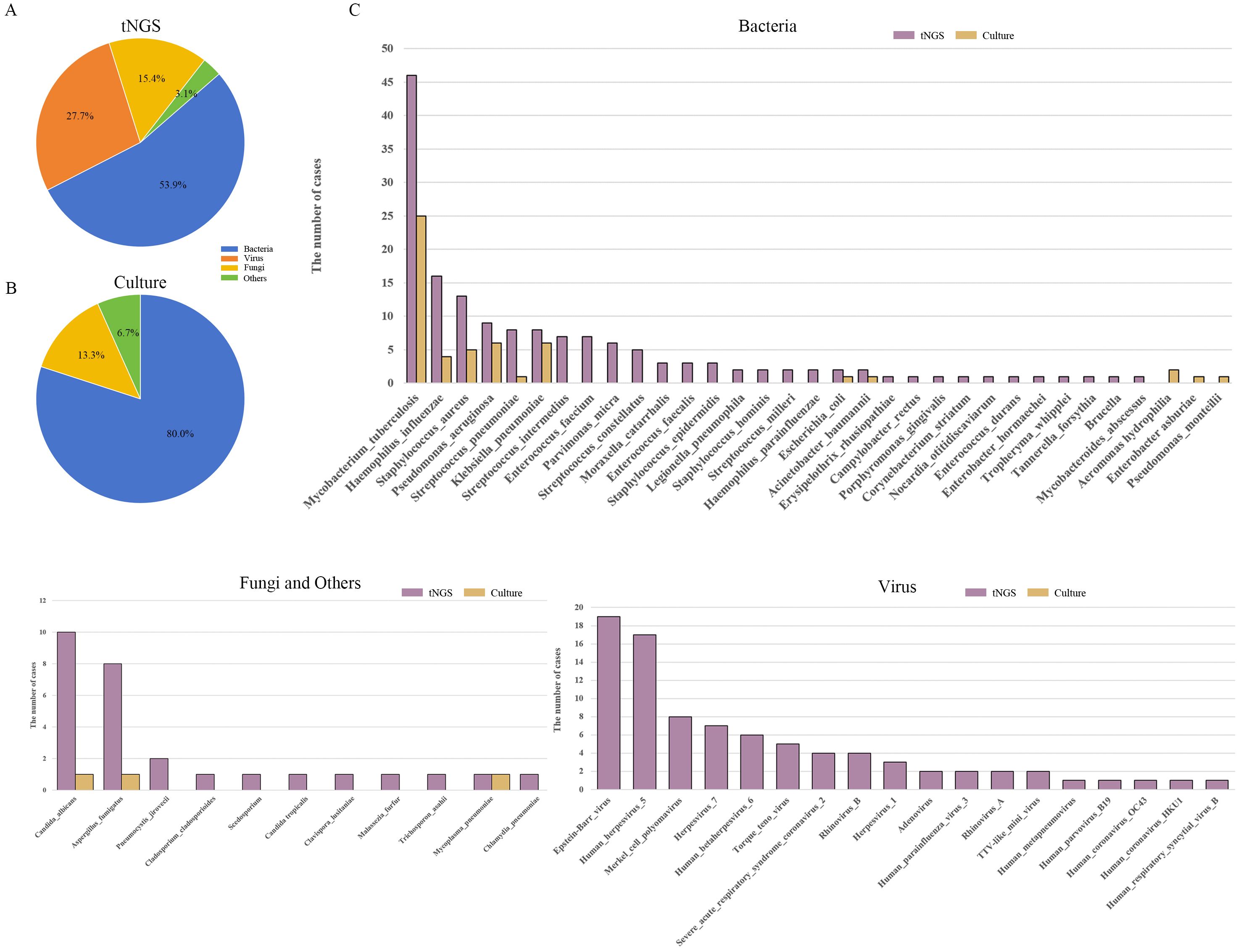 Among the 166 clinical samples submitted for testing, there were 89 fresh tissue, 52 BALF, 22 pleural effusions, and 3 sputum samples. tNGS testing identified a total of 65 pathogens across 135 cases, including 35 bacterial species (53.85%), 10 fungal species (15.38%), 18 viral species (27.69%), in addition to 1 case of Mycoplasma pneumoniae and a case of Chlamydia pneumoniae (Figure 2A). For bacterial detection, the three most prevalent pathogens were Mycobacterium tuberculosis complex (27.71%), Haemophilus influenzae (9.04%), and Staphylococcus aureus (7.23%). Among fungi, the most frequently detected species was Candida albicans (5.42%), followed by Aspergillus fumigatus (4.82%). For viruses, the top three identified pathogens were Epstein-Barr virus (11.45%), Human herpesvirus 5 (10.24%), and Merkel cell polyomavirus (4.82%).