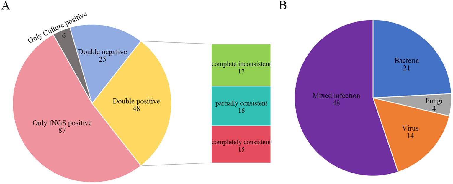 Figure 3. Comparison of tNGS and TPDs. (A) Consistency comparison of tNGS and TPDs result; (B) Infection types among patients positive only for tNGS. Complete inconsistent: TPDs and tNGS detected entirely different organisms from the same sample. Partially consistent: TPDs and tNGS detected some identical organisms while each also detected some unique organisms from the same sample. Completely consistent: TPDs and tNGS detected the same organisms from the same sample. tNGS, targeted next-generation sequencing; TPDs, traditional pathogen detection methods.