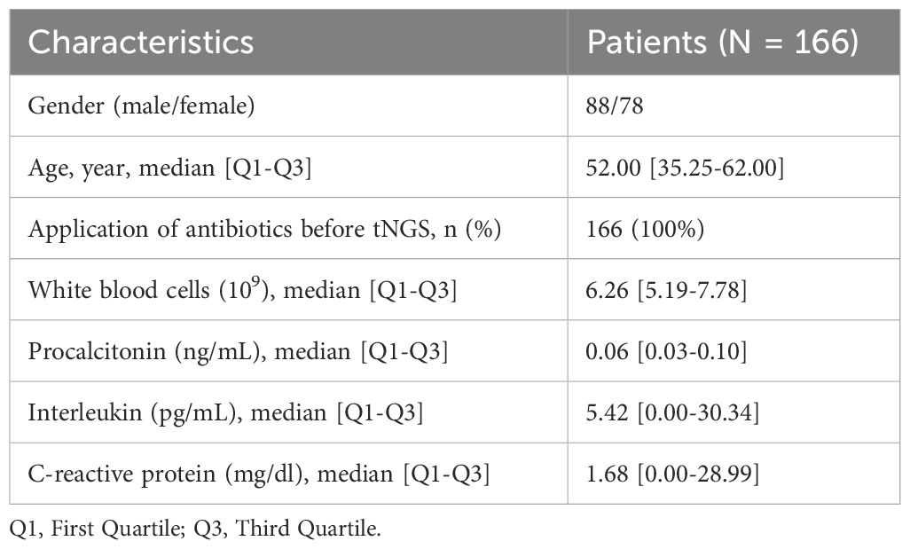 This study enrolled a total of 166 patients suspected of pulmonary infection, who were recruited from March 2024 to April 2025. Specimens from all patients underwent both tNGS and TPDs. The baseline characteristics of the enrolled patients are summarized in Table 1.