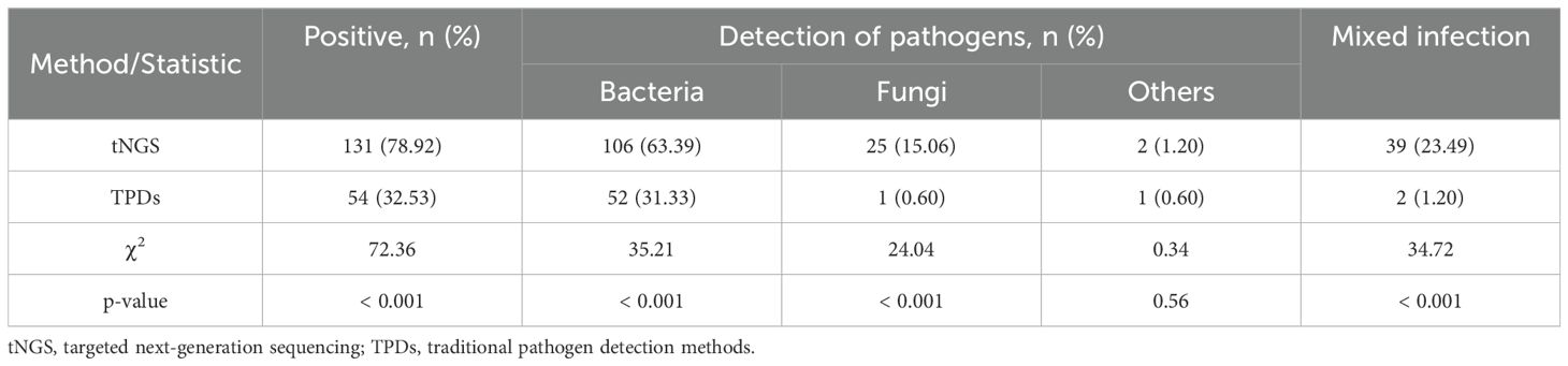 Result: The positive detection rate of tNGS was significantly higher than that of TPDs (81.33% vs. 32.53%, p < 0.001). Among the 166 samples, tNGS identified a total of 65 pathogens, whereas TPDs identified only 14 (11 bacterial species, 2 fungal species, and Mycoplasma pneumoniae). TPDs primarily identified bacteria (including Mycobacterium tuberculosis) and fungi, and were unable to detect viruses. In contrast, tNGS revealed a broader spectrum of pathogens, including 35 bacterial species, 10 fungal species, 18 viral species, as well as Mycoplasma pneumoniae and Chlamydia pneumoniae. Notably, tNGS demonstrated greater efficiency in detecting mixed infections and further identified 16 antibiotic resistance genes (ARGs).