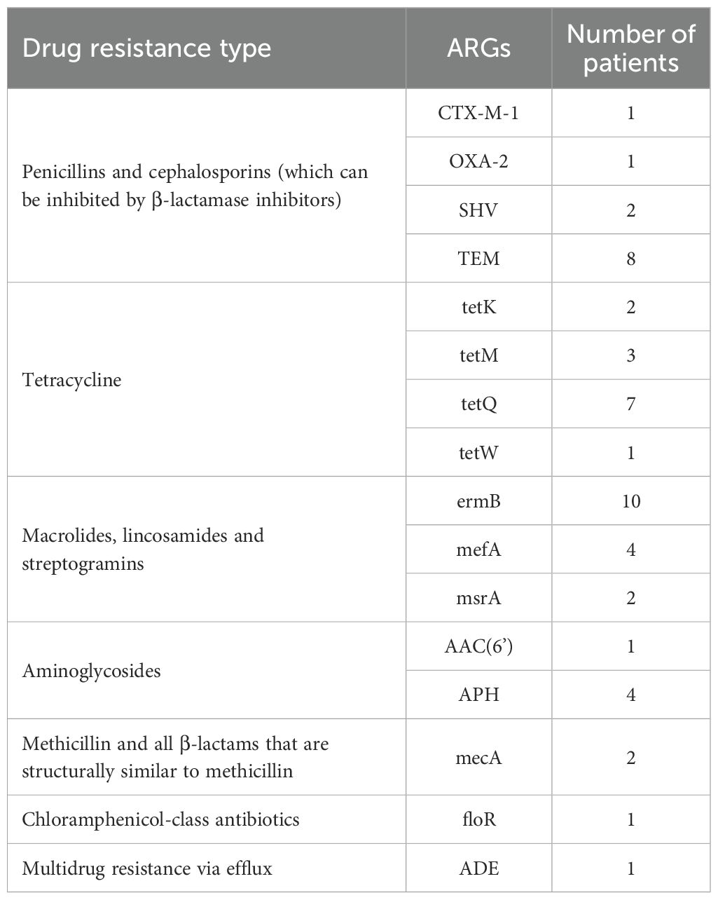 tNGS identified a total of 16 ARGs. Specifically, 10 cases harbored the ermB gene, which confers resistance to macrolides, lincosamides (including lincosamycin), and streptogramins (MLS8 antibiotics). Additionally, 8 cases harbored the TEM gene, which mediates resistance to penicillin and cephalosporin, while 7 cases were carried the tetQ gene, responsible for resistance to tetracycline (Table 3).