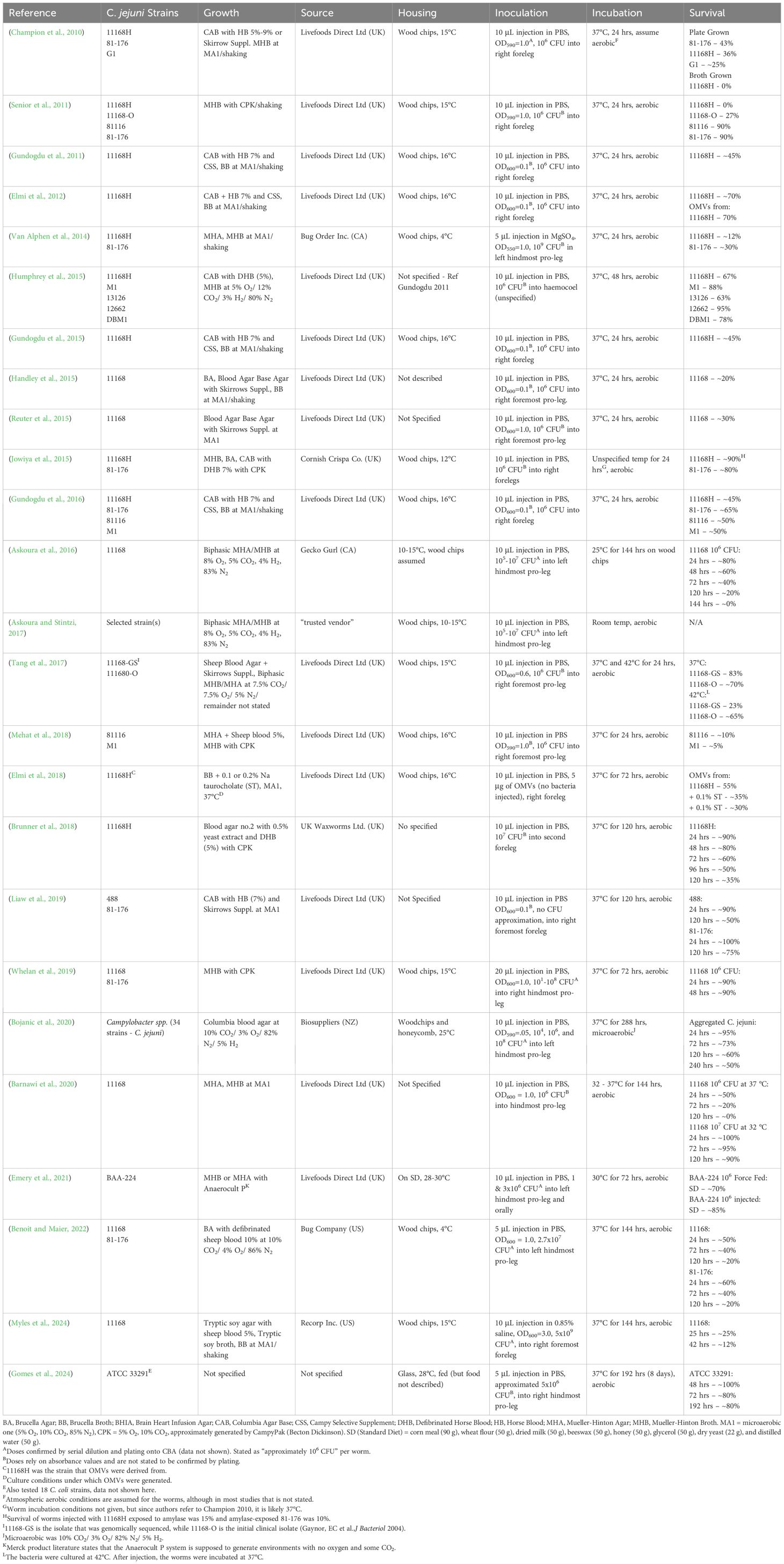 The earliest publication using Galleria with Campylobacter was in 2010 (Champion et al., 2010), which shaped the field as far as experimental methods and approaches. This is an acute, high dose, septic infection model, intended to examine innate host defenses. A major defense mechanism in larva is hemocytes, which are phagocytes analogous to neutrophils in humans (Wojda et al., 2020). Since a hallmark of human Campylobacter infections is gut inflammation (Omole et al., 2024), and neutrophil infiltration into tissues is a major inflammatory marker, bacteria-phagocyte interactions are important to examine. However, how well a disseminated infection (bacteria are injected into the larval body cavity) predicts the outcome of a human or chicken gut infection remains to be seen, as tissues are sterile yet the gut is a microbiologically dense, competitive environment. The infective dose of C. jejuni in humans is approximately 1000 bacteria, while the larva are typically given 105 to 107 CFU. Given that larva body weights are 150–300 mg and a typical adult human body weight is 62 kg, relatively that is more than a million-fold higher dose. A generic description of the larva killing assay (see Table 1 for more details) is: Campylobacter is grown under microaerobic conditions on plates (Columbia blood or MHA) or broth (Brucella or MHB) and suspended in PBS, with bacterial concentration approximated using OD (adjusted to 0.1 or 1.0). Larva maintained at lower temperatures (10 to 17°C) and starved for 2-8d are injected with 10 μL of the bacterial suspension, typically near the right foreleg, then transferred to 37°C and observed for darkening (the immune melanization response) and death, which is often rapid (24 hrs or less). Groups of ten larva are used for different conditions or strains, often in triplicate (so total n=30 for each condition). In Champion’s foundational study (Champion et al., 2010), three strains (11168H, G1, and 81-176) displayed equivalent killing (~70% at 24 hrs and 37°C) when grown on Columbia blood agar plates. Interestingly, strain 11168H grown in MHB killed all infected larva by 24 hrs (data from other two strains not shown). Perhaps the physiological state of the bacteria is different (such as flagella being used more in liquid versus the plate), or the suspension method from plates may expose the bacteria to more oxygen than when from broth. The larva are in a stressed state, since they have been starved for up to a week, and experienced a major temperature shift just after infection (from 15°C to 37°C). However, uninfected controls were included and none died in the 24 hr observation period. The authors of this publication chose to display survival of the larva at only one timepoint with column graphs, each column representing one group. This choice has been replicated often in the field as the dominant visualization of the killing assay. Note, with other animal challenge studies, the standard choice is Kaplan-Meier survival curves. The C. jejuni strain most commonly used for infection of G. mellonella is NCTC 11168 (and its hypermotile derivative, 11168H), see Table 1. While 11168 is referred to as the type strain in some publications (Pascoe et al., 2019; Whelan et al., 2019), the ATCC lists the Cj subsp. jejuni type strain as the bovine isolate CIP 702, also known as NCTC 11351 or ATCC 33560 (Campylobacter jejuni subsp. jejuni (Jones et al.) Steele and Owen, 2016).