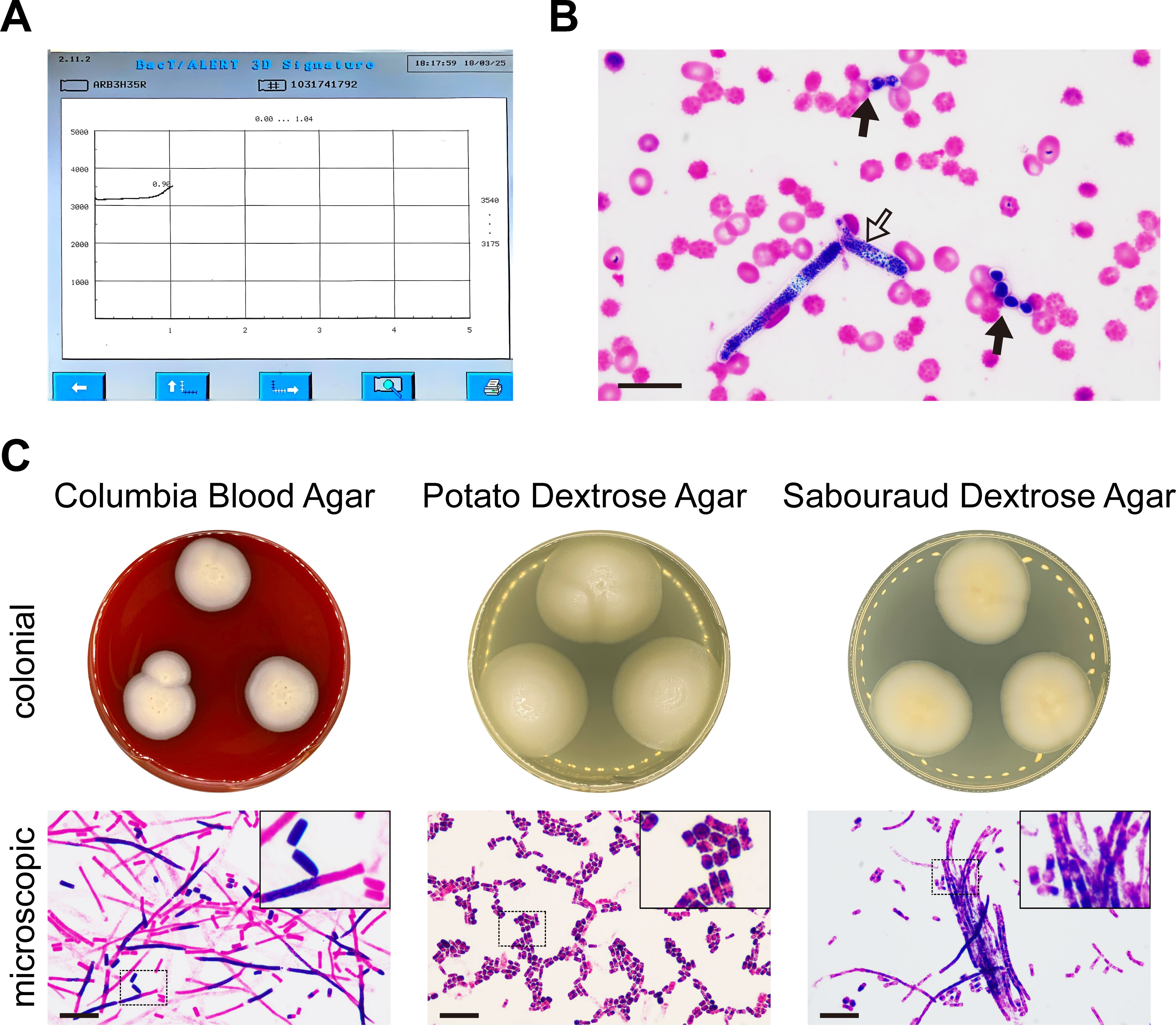 Figure 1. Apiotrichum veenhuisii in positive blood culture. (A) The growth curve of the microorganisms was plotted by the automated blood culture system that recorded the reflectance units of the culture mediums in real time over a 5-day period. (B) Representative image of the blastospores (solid arrows) and arthroconidia (hollow arrow) in smear from positive blood culture was captured under optical microscope after Gram staining. Bar, 20 μm. (C) The colonial and microscopic morphology of Apiotrichum veenhuisii grew in different culture mediums. The hyphae and spores were observed under optical microscope after Gram staining. The upper right corners show the partial magnification of sections marked with dashed boxes. Bar, 20 μm.