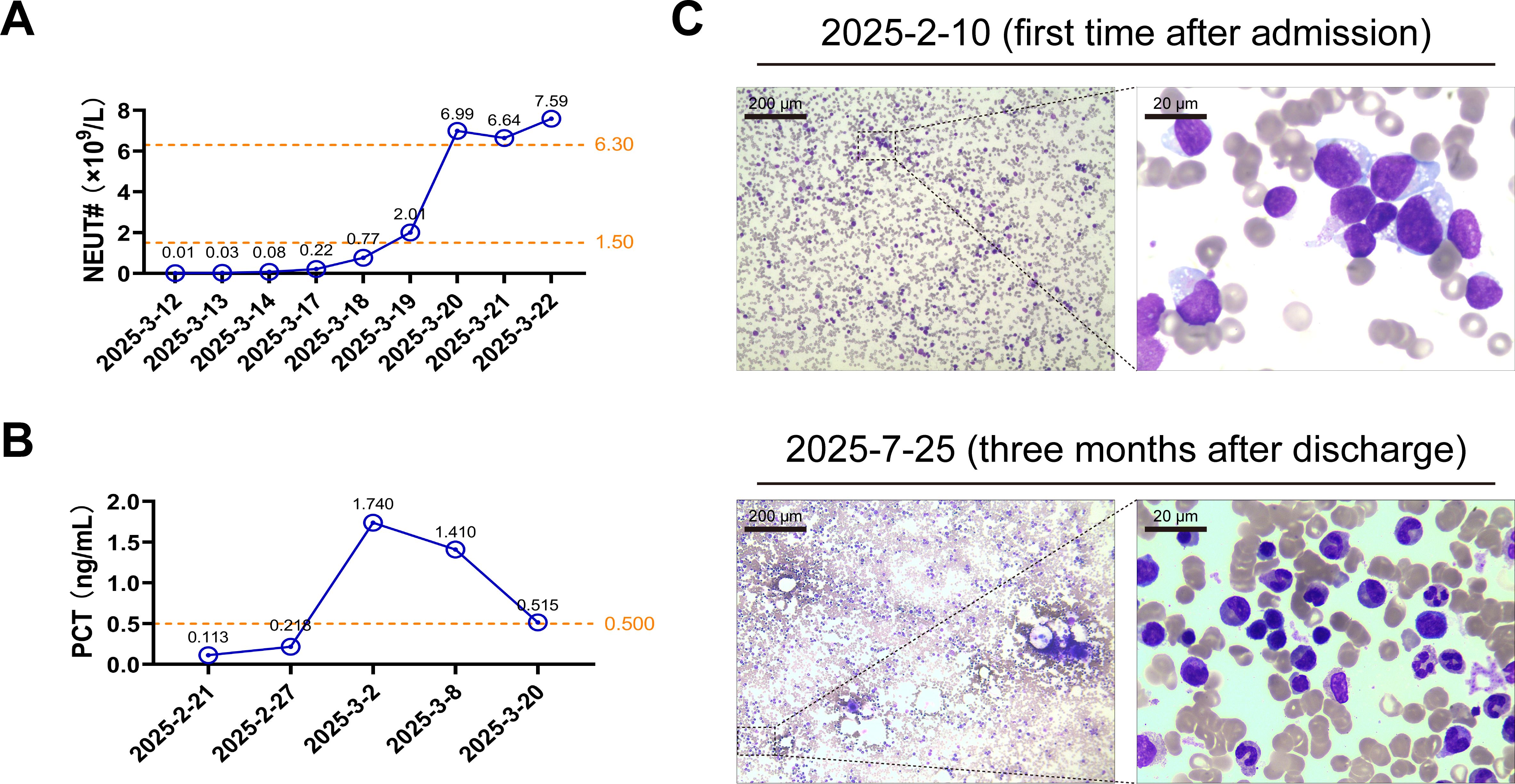 Figure 2. The patient received an optimistic outcome after treatments. (A, B) The patient’s peripheral blood neutrophil counts (NEUT#) and serum procalcitonin (PCT) concentrations were measured on the indicated dates. The exact values are marked above each point. The orange dotted lines represent the edges of reference intervals. (C) The bone marrow smears obtained from the patient on the indicated date were examined under the optical microscope following Wright-Giemsa staining. Representative images of the partial magnification below show the blood cells in detail.