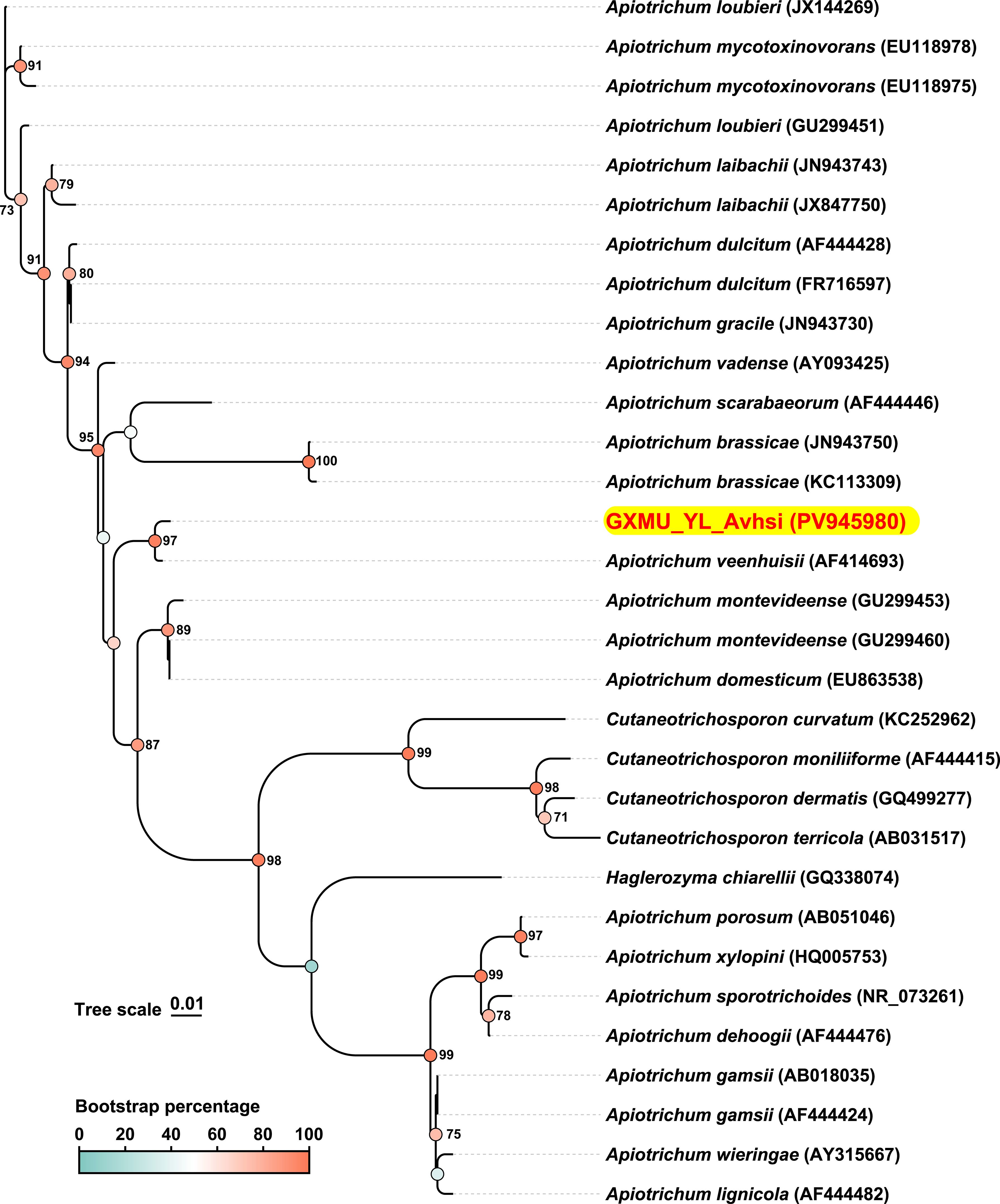 Figure 3. Internal transcribed spacer (ITS)-based phylogenetic tree generated by whole-genome sequencing. The ITS sequence of Apiotrichum veenhuisii obtained in this study is presented with red-on-yellow highlighting. Accession numbers of sequences in GenBank are given in brackets behind the strain names. The color represents the bootstrap percentage which was based on 1000 replicates. Only the values greater than or equal to 70% are labeled as percentages at branching points. Scale bar indicates 0.01 substitutes per nucleotide position.