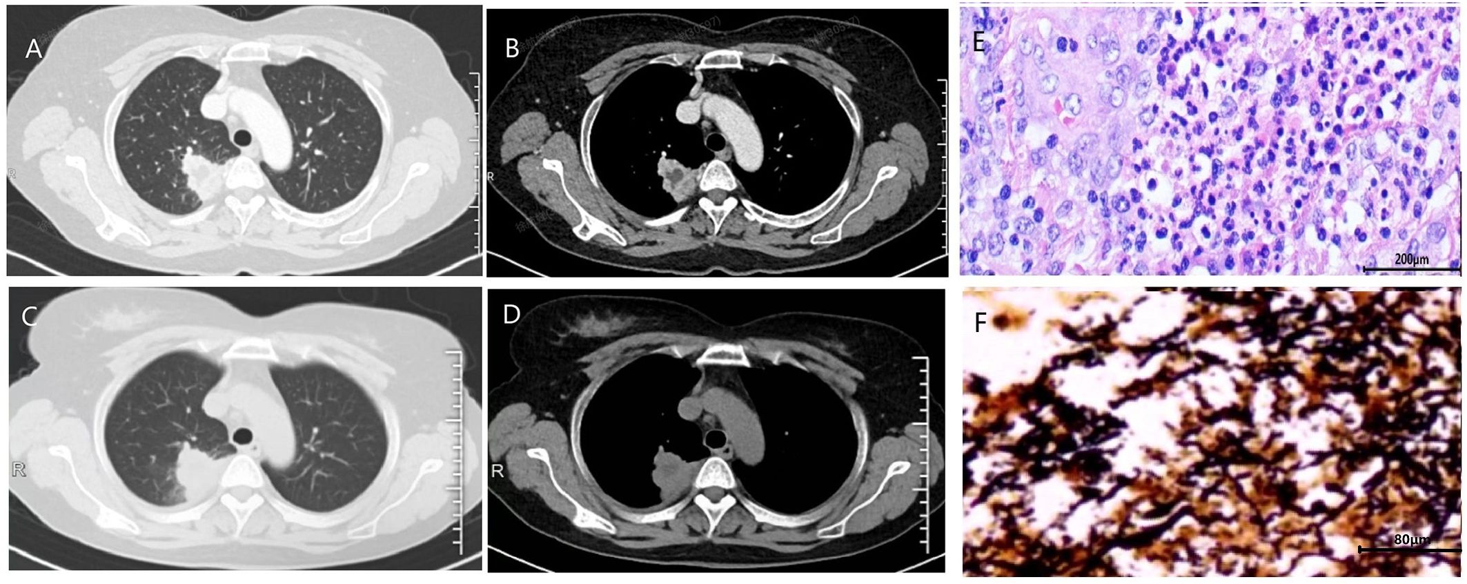 Figure 1. The initial chest CT of case 7 demonstrated mass-like opacities and necrosis (A, lung window; B, soft tissue window). After 6 months of treatment, a follow-up lung CT scan showed significant absorption and improvement of the lung lesion, with residual cavities (D, lung window; E, soft tissue window). Bronchoscopy examination shows purulent discharge in the lumen of the basal segment branch of the right lower lobe (C).