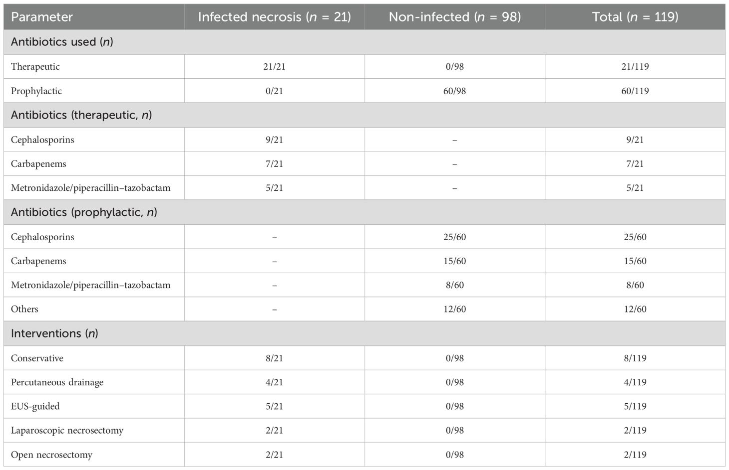 We extracted demographic data [age, sex, and body mass index (BMI)], clinical features [etiology, Bedside Index for Severity in Acute Pancreatitis (BISAP) score, admission C-reactive protein (CRP), and lipase levels], imaging findings, microbiological results, complications (infected necrosis, abscess, and colonic perforation), treatments (antibiotic use and interventions), and outcomes [length of hospital stay, intensive care unit (ICU) admission, and mortality]. Two independent reviewers collected information from electronic medical records, and discrepancies were resolved by a third reviewer. Missing data, including incomplete follow-up in 10 of 21 infected cases, were documented but not imputed due to the retrospective design. Infection was confirmed by positive cultures from FNA, drainage, or necrosectomy, or by characteristic radiological features such as intralesional gas in clinically deteriorating patients. Severity was assessed using the BISAP, with scores ≥3 defining severe disease (Wu et al., 2008). Antibiotic therapy was administered within 24 h of infection confirmation and tailored to culture results, including cephalosporins for E. coli and carbapenems for MDR strains. Prophylactic antibiotics (cephalosporins, carbapenems, or metronidazole/piperacillin–tazobactam) were administered in severe non-infected AP (BISAP ≥ 3 or necrosis > 30%), or when concomitant infections such as cholecystitis or cholangitis were suspected, according to local guidelines. Conservative management included fluid resuscitation, pain control, and early enteral nutrition within 48 h via nasogastric or nasojejunal tubes when feasible. Total parenteral nutrition (TPN) was reserved for patients with ileus or following interventions. Minimally invasive approaches included percutaneous drainage for abscesses and endoscopic ultrasound (EUS)-guided cystogastrostomy or necrosectomy for walled-off necrosis (>4 weeks). Surgical necrosectomy (laparoscopic or open) was performed when endoscopic treatment failed or when necrosis was solid or inaccessible. Cholecystectomy was undertaken during the index admission for gallstone-related non-infected AP or at the time of necrosectomy in infected cases.