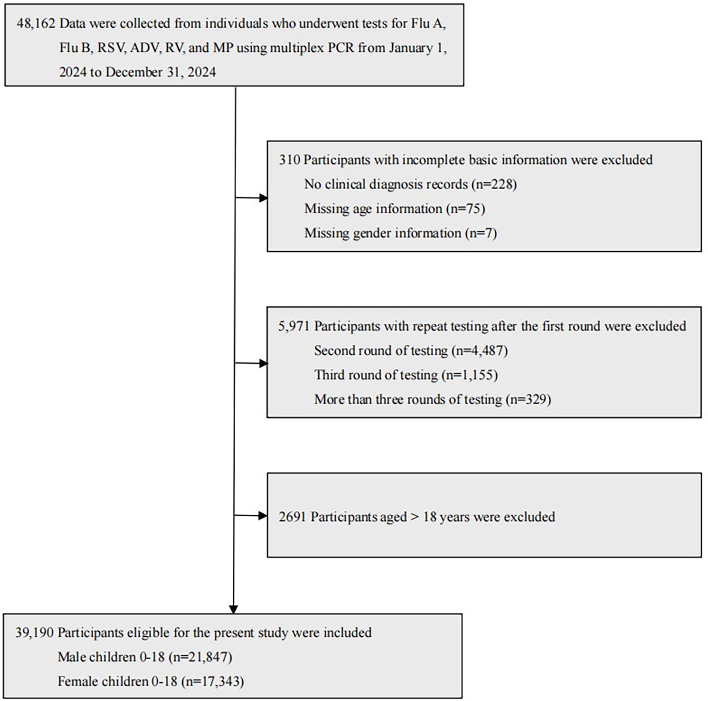 A retrospective cross-sectional study was conducted at Chengdu Women’s and Children’s Central Hospital, School of Medicine, University of Electronic Science and Technology of China, covering the period from January 1, 2024, to December 31, 2024. A total of 48,162 individuals underwent tests for Flu A, Flu B, RSV, ADV, RV, and MP using multiplex PCR on pharyngeal swab specimens. Among them, 39,190 eligible child participants were included in the present study, comprising 21,847 male participants aged 0–18 years (mean age: 3.29 ± 3.02 years) and 17,343 female participants aged 0–18 years (mean age: 3.59 ± 3.10 years). Specifically, children were divided into six age groups: 1,451 newborns aged 0 to 28 days, 7,222 infants aged 29 days to 1 year, 8,599 toddlers aged 1 to 3 years, 12,778 preschoolers aged 3 to 6 years, 8,491 school-aged children aged 6 to 12 years, 649 adolescents aged 12 to 18 years. The child participant selection process is described in detail in Figure 1.