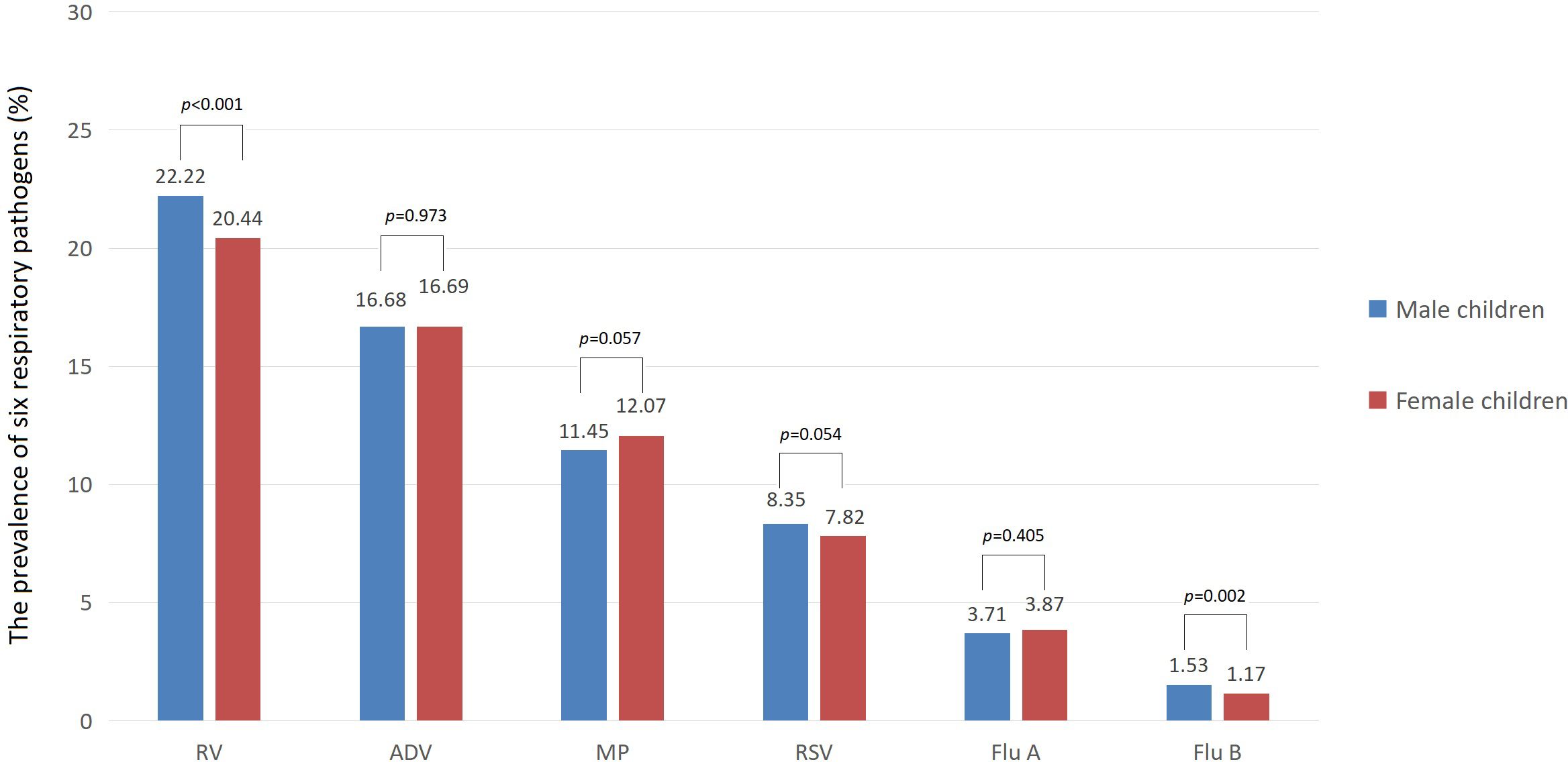In terms of gender, the prevalence of Flu B and RV was slightly higher among male children than among female children (1.53% vs 1.17% for Flu B, 22.22% vs 20.44% for RV, both p < 0.01). However, there was no significant difference in the prevalence of Flu A, RSV, ADV, and MP between male and female children (all p>0.05). In terms of medical settings, the prevalence of Flu A, Flu B, and ADV among children was higher in outpatient than in inpatient (7.68% vs 2.82% for Flu A, 2.22% vs 1.16% for Flu B, 30.71% vs 13.23% for ADV, all p < 0.001). However, the prevalence of RSV, RV, and MP among children was lower in outpatient than in inpatient (5.90% vs 8.66% for RSV, 15.83% vs 22.82% for RV, 9.57% vs 12.26% for MP, all p < 0.001). The prevalence of six respiratory pathogens among male and female children is shown in Figure 2.