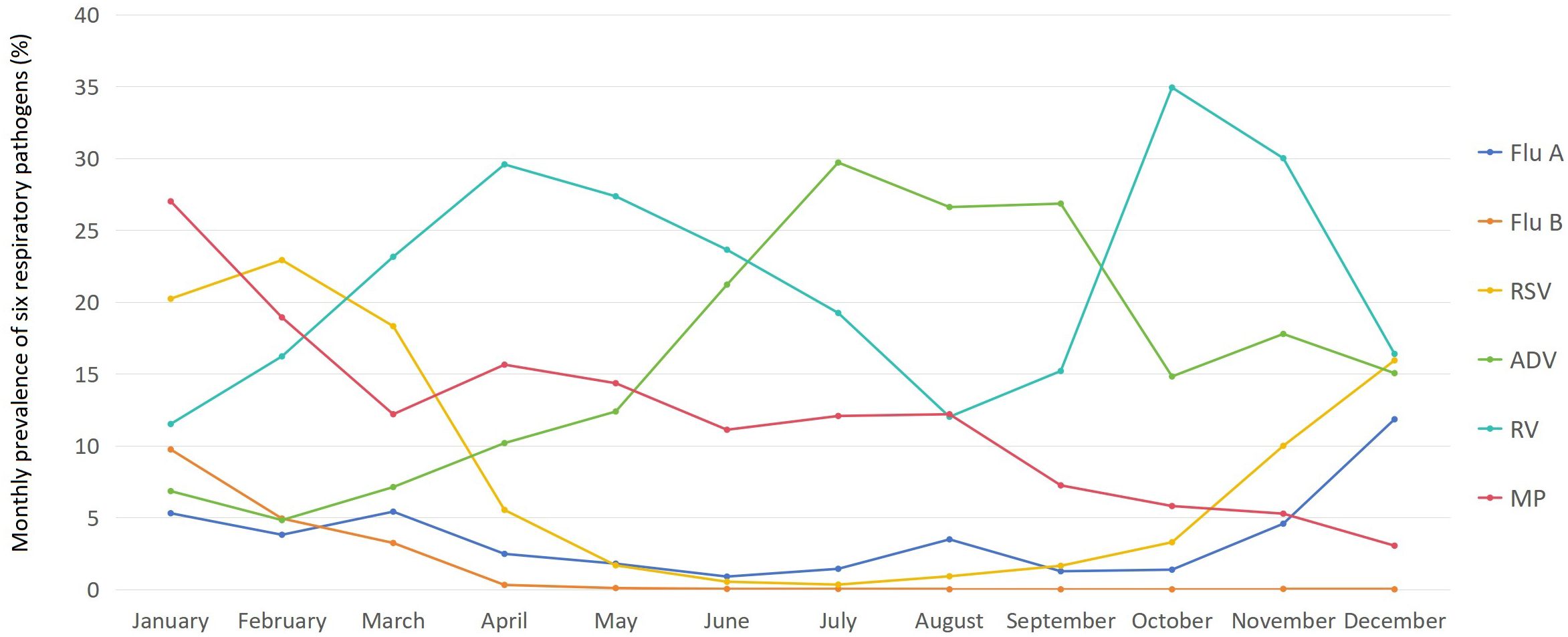 We found that in addition to seasonal variations of six pathogens, significant monthly differences were observed in their prevalence. Flu A peaked in December (11.84%), followed by March (5.41%) and January (5.30%), with low levels (<2%) from May–July and September–October. Flu B was the highest in January (9.74%), then in February (4.93%) and March (3.23%), but extremely low (<0.1%) from May–December. RSV peaked in February (22.92%), January (20.23%), and March (18.32%), with low levels (<2%) from May–September. ADV was generally high: <10% only in January–March, >20% in June–September. RV exceeded 10% monthly (the lowest prevalence 11.51% in January), with >30% in October–November and 20–30% in March–June. MP was high overall, peaking in January (27.01%), >10% from February–August, >5% from September–November, and <5% only in December (3.04%). These monthly prevalence characteristics further reflect the potential association between China’s seasonal weather conditions (e.g., temperature, humidity) and pathogen transmission, laying a foundation for subsequent analysis of seasonal patterns.