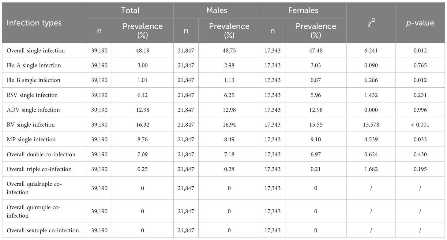 More than half (55.53%) of the children were infected with at least one of the six respiratory pathogens. The overall prevalence of single infection, double co-infection, and triple co-infection was 48.19%, 7.09%, and 0.25%, respectively, with no quadruple, quintuple, or sextuple co-infections observed. The pathogen-specific prevalence from the highest to the lowest was as follows: RV (21.43%), ADV (16.69%), MP (11.73%), RSV (8.12%), Flu A (3.78%), and Flu B (1.37%) (χ2 = 12,221.187, p < 0.001). For single infections, the pathogens with the highest prevalence were RV (16.32%), ADV (12.98%), and MP (8.76%), while those with the lowest prevalence were Flu B (1.01%), Flu A (3.00%), and RSV (6.12%). For double co-infections, the combinations with the highest prevalence were ADV+RV (2.18%), RV+MP (1.48%), and RSV+RV (0.94%), whereas those with the lowest prevalence were Flu A+Flu B (0.01%), Flu B+ADV (0.05%), and Flu B+RV (0.05%). For triple co-infections, ADV+RV+MP (0.08%), RSV+ADV+RV (0.05%), and RSV+RV+MP (0.03%) showed the highest prevalence, in contrast to the three combinations including Flu A+Flu B+ADV, Flu A+RSV+MP, and Flu B+RSV+ADV, for which no cases were detected. The prevalence of single infection and multiple co-infections with the six pathogens among male and female children and the prevalence of specific double co-infections and triple co-infections with these six pathogens in 39,190 children are reported in Table 1 and Table 2, respectively.