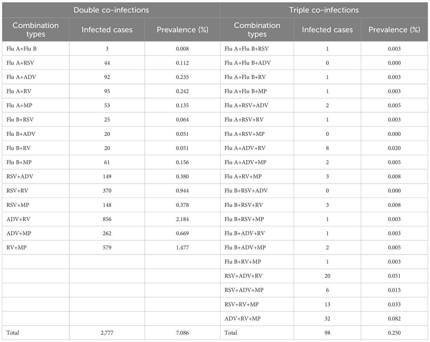 Table 2. Prevalence of specific double co-infections and triple co-infections with Flu A, Flu B, RSV, ADV, RV, and MP in 39,190 children.