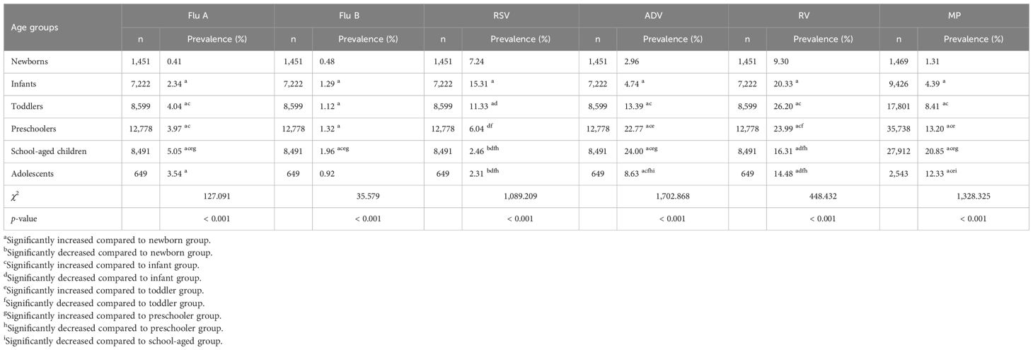 In our study, the prevalence of Flu A, Flu B, ADV, and MP was the highest in school-aged children (5.05%, 1.96%, 24.00%, 20.85%) and the lowest in newborns (0.41%, 0.48%, 2.96%, 1.31%), significant differences were obtained in prevalence across six age groups (all p < 0.001); RSV was most prevalent in infants (15.31%) and least in adolescents (2.31%), with significant intergroup differences (p < 0.001); RV peaked in toddlers (26.20%) and was the lowest in newborns (9.30%; p < 0.001 across groups). Multivariate logistic regression (compared with newborns) showed Flu A, RV, and MP positivity were independently associated with all other age groups (higher ORs, all p < 0.001), with peak ORs in school-aged children for Flu A (OR: 9.410, 95% CI: 4.183–21.165) and MP (OR: 31.875, 95% CI: 20.179–50.351), and in toddlers for RV (OR: 4.003, 95% CI: 3.328–4.814); Flu B positivity associated with infants, preschoolers, and school-aged children (all p < 0.05), peaking in school-aged children (OR: 3.905, 95% CI: 1.819–8.383); ADV positivity associated with toddlers, preschoolers, school-aged children, and adolescents (all p < 0.01), with the highest OR in preschoolers (OR: 6.361, 95% CI: 4.673–8.659); RSV positivity associated with infants, toddlers, school-aged children, and adolescents (all p < 0.01), with higher ORs in infants/toddlers but lower in school-aged children/adolescents.