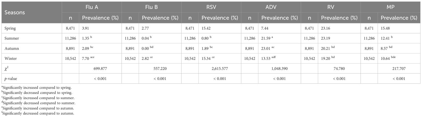 Our study showed Flu A, Flu B, and RSV prevalence was higher in spring and winter than summer and autumn (p < 0.001); Flu A was more prevalent in winter than spring (7.70% vs 3.91%, p < 0.05), with no winter-spring differences for Flu B (2.82% vs 2.77%, p>0.05) or RSV (15.34% vs 15.42%, p>0.05). MP and RV were more common in spring and summer (p < 0.001); MP was higher in spring than summer (15.48% vs 12.41%, p < 0.05) and winter than autumn (10.64% vs 8.57%, p < 0.05), while RV showed no spring-summer (23.16% vs 23.19%, p>0.05) or winter-autumn (19.20% vs 20.21%, p>0.05) differences. ADV prevalence was significantly higher in autumn and summer than in winter and spring (p < 0.001), with that in autumn higher than in summer (23.01% vs 21.59%, p < 0.05) and that in winter higher than in spring (13.53% vs 7.44%, p < 0.05). Multivariate regression (compared with spring) showed Flu A, ADV, and MP were independently associated with summer, autumn, and winter (all p < 0.001): ADV had the highest OR in autumn (OR: 2.700, 95% CI: 2.444–2.983); MP had the lowest OR in autumn (OR: 0.526, 95% CI: 0.509–0.621); Flu A had higher OR in winter but lower in summer/autumn. Flu B associated with summer (OR: 0.013, p < 0.001), not autumn and winter. RSV associated with summer (OR: 0.052) and autumn (OR: 0.124, both p < 0.001), not winter. RV associated with autumn (OR: 0.924) and winter (OR: 0.809, both p < 0.05), not summer.