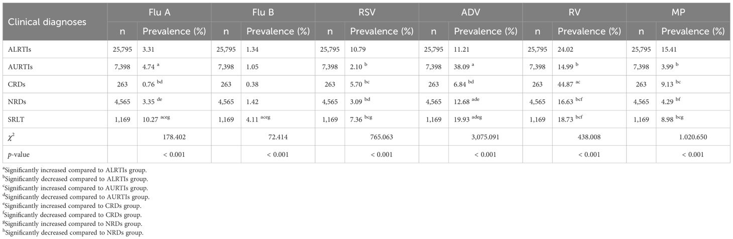 Our findings, integrated with prior research, reveal distinct pathogen distributions across the five clinical groups, and these patterns associate clinical diagnoses to pathogen-specific risks, aiding targeted management. Flu A and Flu B showed the highest prevalence in the SRLT group and the lowest in the CRDs group. Additionally, the AURTIs group had a significantly higher Flu A prevalence compared with the ALRTIs group (p < 0.05). Aligning with Pratt MTG et al. on RSV significance, RSV dominated in ALRTIs (10.79%) but was less common in AURTIs (OR: 0.297) and NRDs (OR: 0.329). ADV ability to cause both AURTIs and ALRTIs, as noted by Shieh WJ et al., was further supported by our findings showing its high prevalence in the AURTIs group (38.09%, OR: 3.250) and low prevalence in the CRDs group (6.84%, OR: 0.449). MP can affect both respiratory tracts as Kumar S et al. noted, which aligns with our finding of its presence across groups. However, our study further specifies its predominance in ALRTIs (15.41%) and lower rates in AURTIs (3.99%) and NRDs (OR: 0.180), whereas their research focuses on its dual-tract involvement. Notably, RV shows a distinct distribution across clinical groups, with the highest prevalence in CRDs (44.87%, OR: 2.374) and a lower but still substantial rate in AURTIs (14.99%). This further underscores these pathogen-clinical associations and supports tailored diagnostic and management strategies.