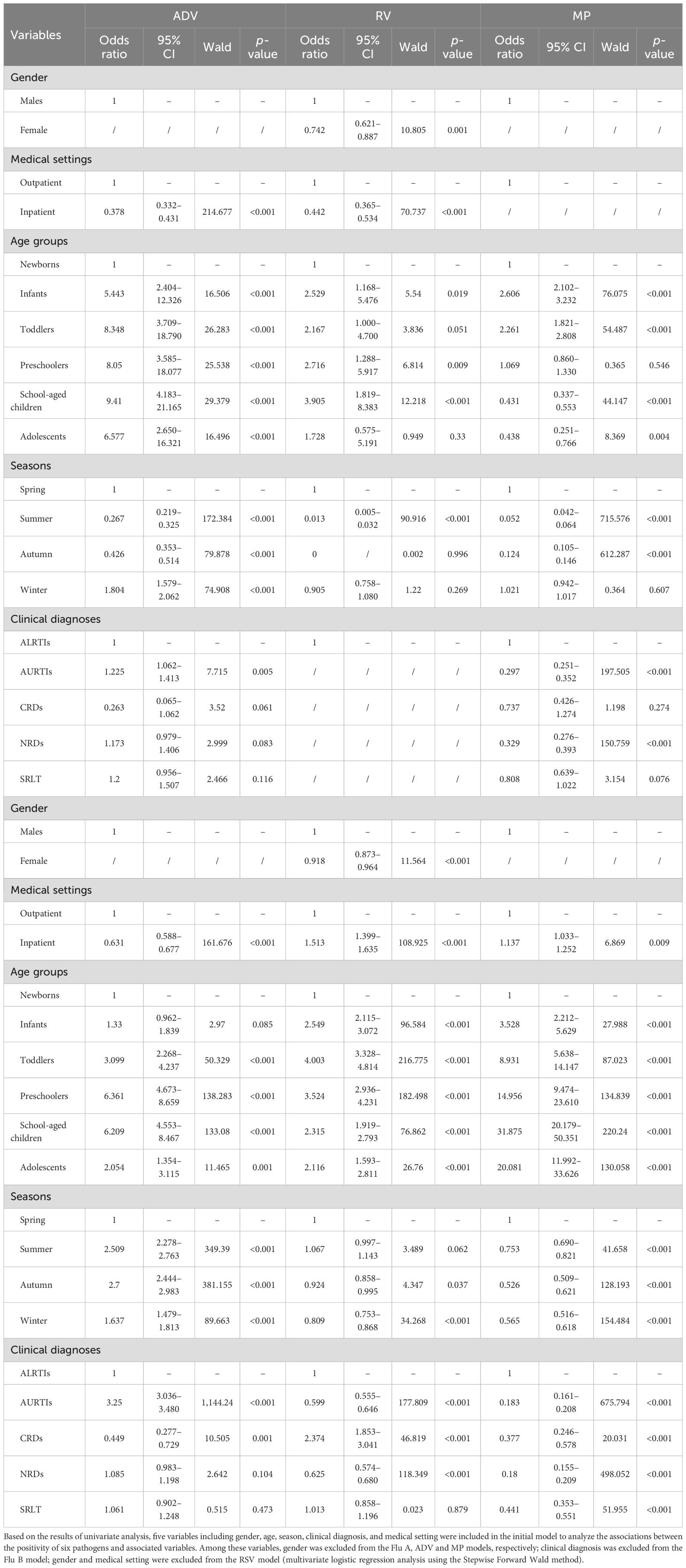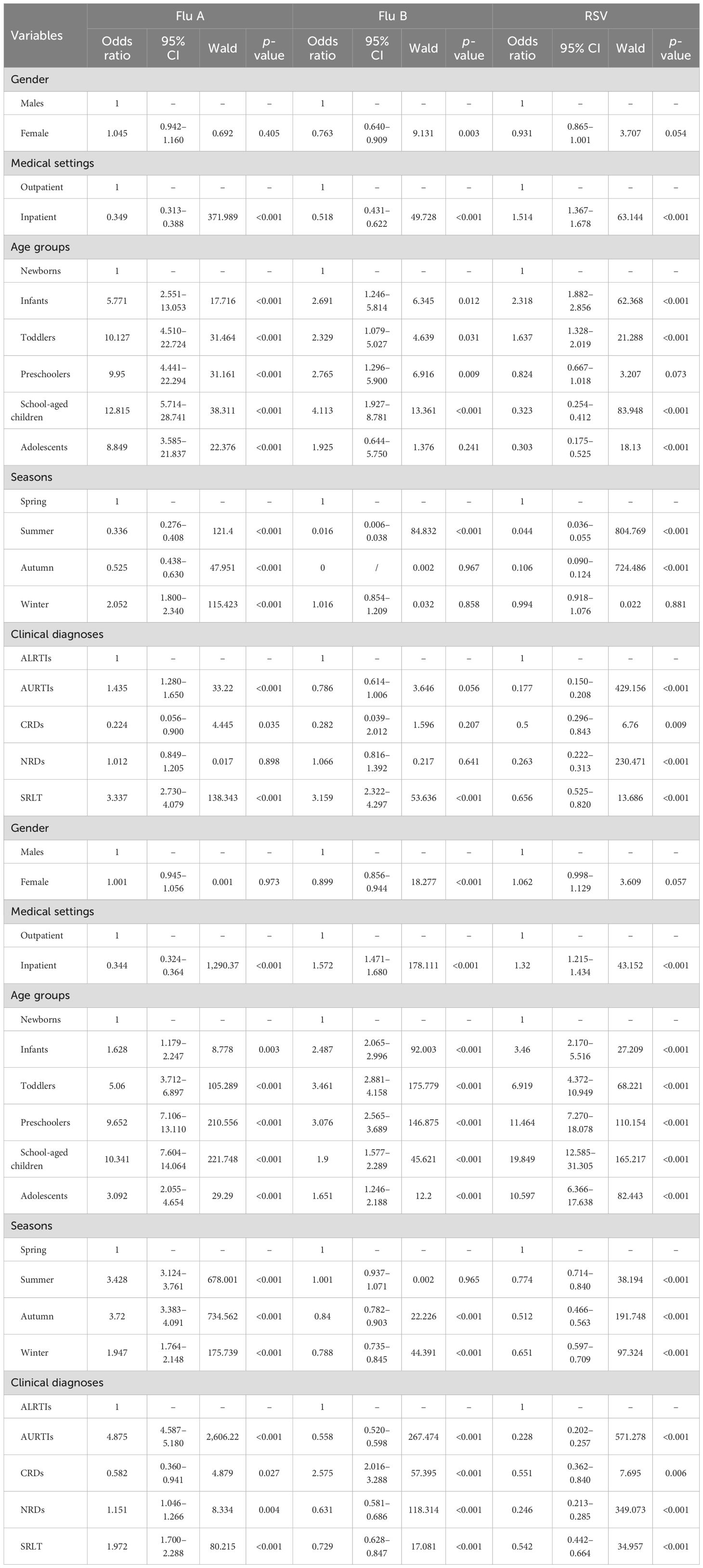 Table 7 and its (Continued) present the results of stepwise multivariate logistic regression analysis after adjustment for potential confounders. Flu B positivity was independently associated with gender (females vs males, OR: 0.742, 95% CI: 0.621–0.887, p = 0.001). Similarly, RV positivity was also independently associated with gender (females vs males, OR: 0.918, 95% CI: 0.873–0.964, p < 0.001). However, no association was observed between Flu A, ADV, RSV, or MP positivity and gender (females vs males). Flu A, Flu B, ADV, RV, and MP positivity were independently associated with medical settings (inpatient vs outpatient, all p < 0.01), but RSV positivity was not associated with medical settings. Compared with the newborns, Flu A, RV, and MP positivity were independently associated with the infants, toddlers, preschoolers, school-aged children, and adolescents (all p < 0.001), with all these age groups showing higher ORs. The highest OR was observed in the school-aged children for the Flu A model (OR: 9.410, 95% CI: 4.183–21.165), the toddlers for the RV model (OR: 4.003, 95% CI: 3.328–4.814), and the school-aged children for the MP model (OR: 31.875, 95% CI: 20.179–50.351), respectively. Flu B positivity was independently associated with the infants, preschoolers, and school-aged children (all p < 0.05), with all these groups showing higher ORs and the school-aged children having the highest (OR: 3.905, 95% CI: 1.819–8.383). ADV positivity was independently associated with the toddlers, preschoolers, school-aged children, and adolescents (all p < 0.01), with all these groups showing higher ORs and the preschoolers having the highest (OR: 6.361, 95% CI: 4.673–8.659). RSV positivity was independently associated with the infants, toddlers, school-aged children, and adolescents (all p < 0.01): higher ORs were observed in the infants and toddlers, while lower ORs were seen in the school-aged children and adolescents.