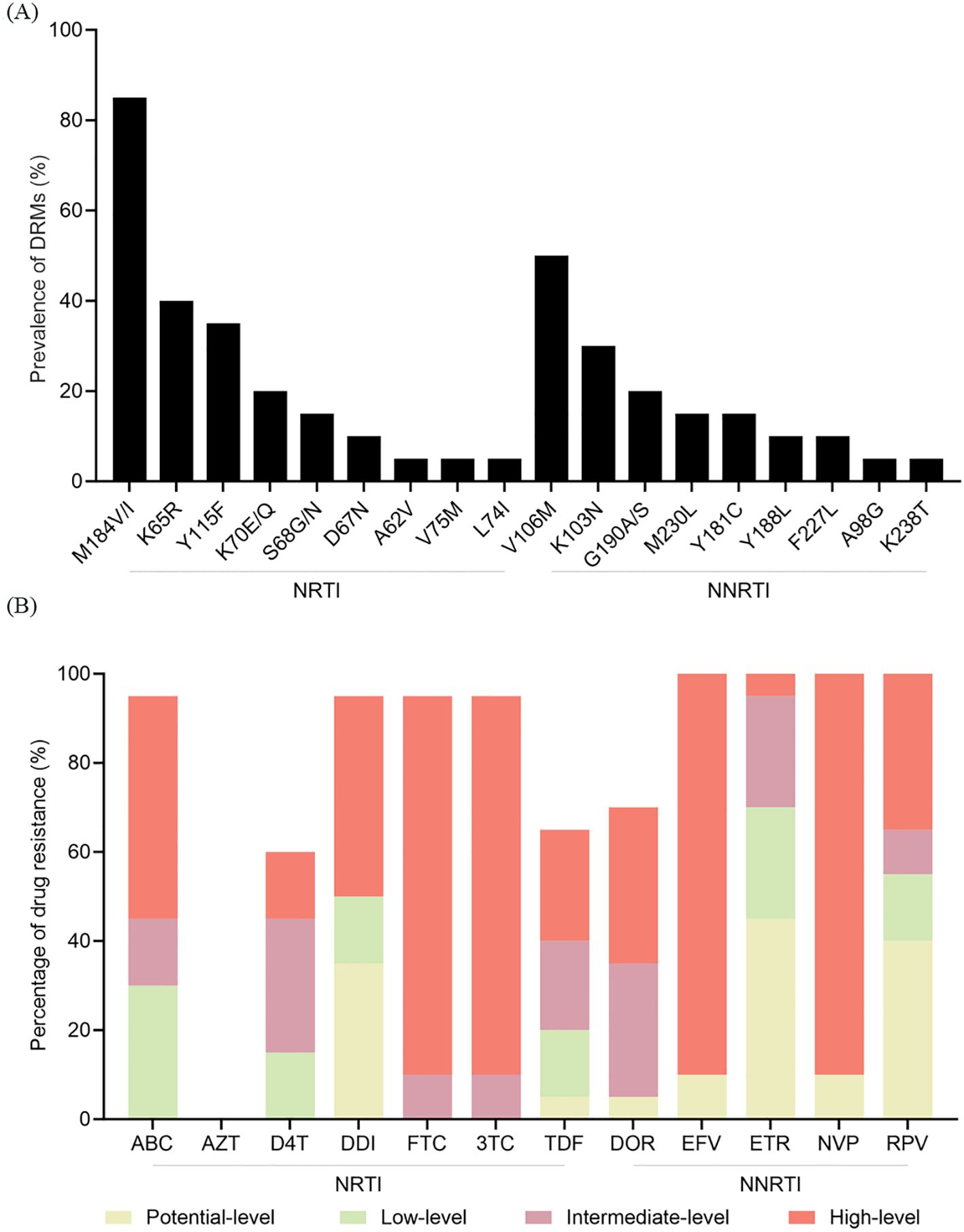 Figure 2. ADR profiles in the V179D/E group. (A) Newly emerged mutations identified during follow-up. (B) Cumulative drug resistance to various ARVs. NRTI, nucleoside reverse transcriptase inhibitor; NNRTI, non-nucleoside reverse transcriptase inhibitor; DRM, drug resistance mutation; ABC, abacavir; AZT, zidovudine; D4T, stavudine; DDI, didanosine; FTC, emtricitabine; 3TC, lamivudine; TDF, tenofovir disoproxil fumarate; DOR, doravirine; EFV, efavirenz; ETR, etravirine; NVP, nevirapine; RPV, rilpivirine; ADR, antiretroviral therapy; ARV, antiretroviral.