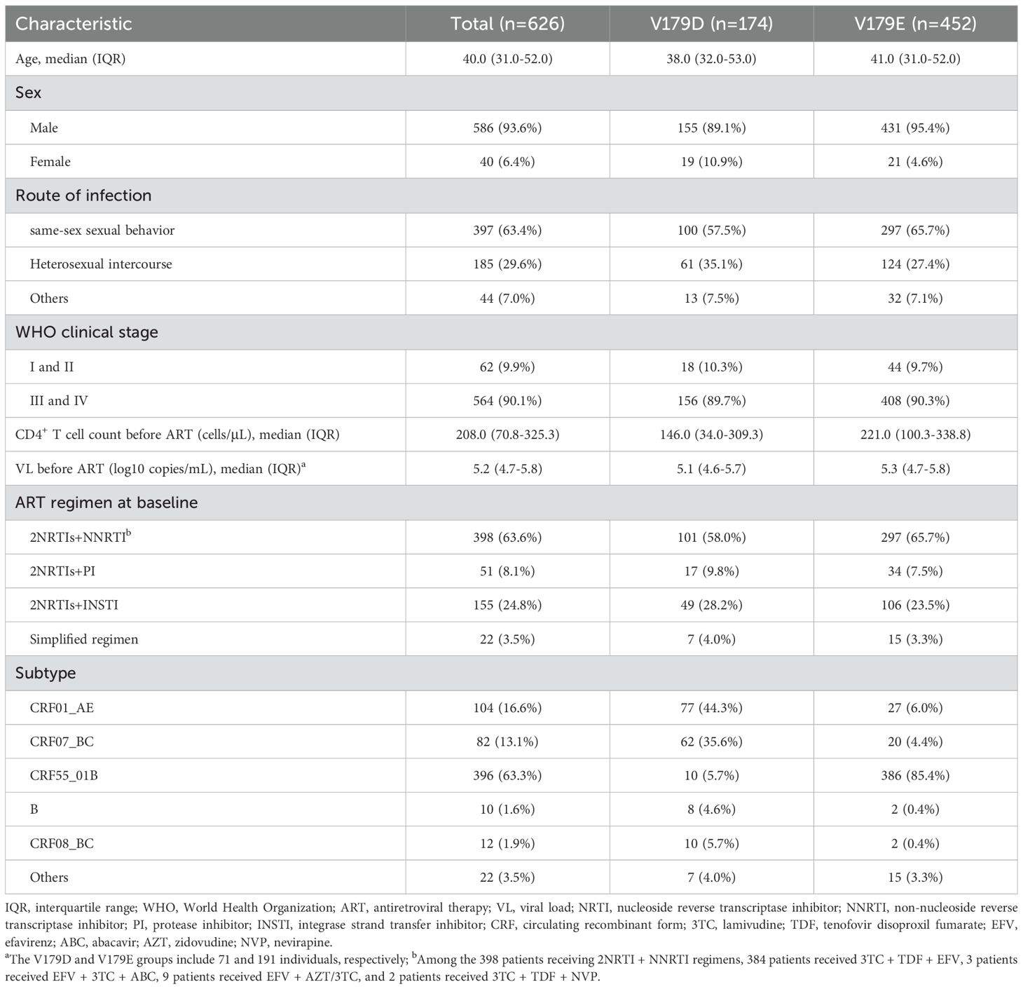 In total, 6021 patients underwent PDR testing during the study period. Among them, 14.8% (893/6021) were found to carry either V179D or V179E. Specifically, the detection rate of V179D was 4.3% (259/6021), while that of V179E was 10.5% (634/6021). After excluding patients who had discontinued ART, were lost to follow-up, or were referred elsewhere, 626 patients were included in the final analysis.