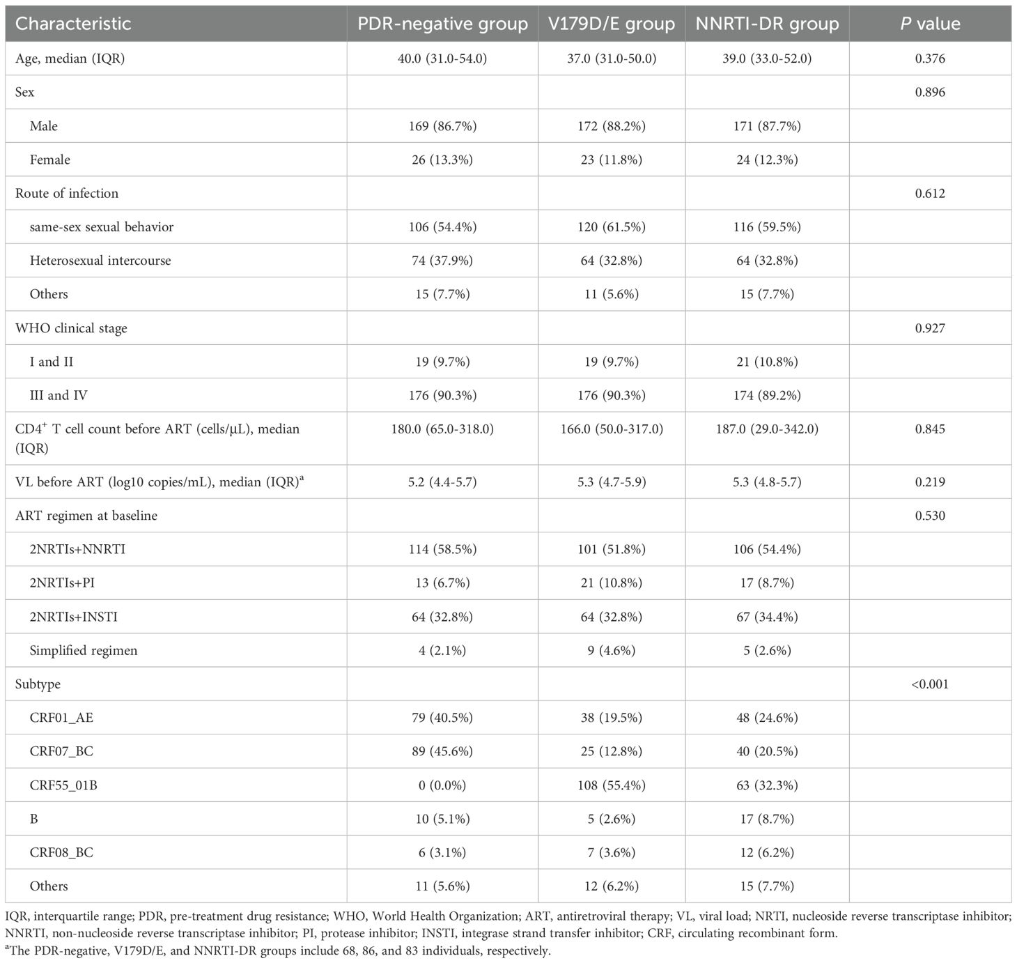 V179D/E is polymorphic NNRTI-associated mutation that typically confer potential low levels of resistance. However, some studies have reported that patients with this mutation show poorer virological and immunological responses to EFV-based regimens than to PI- or INSTI-based therapies (Wang et al., 2023). Conversely, other studies have suggested that although V179D/E reduces NNRTI susceptibility in vitro (Vink et al., 2016), it does not significantly affect the clinical efficacy of NNRTI-based regimens or CD4+ T cell count recovery. Thus, the clinical significance of the V179D/E mutation remains controversial. Further studies are required to clarify their effects on first-line treatment efficacy, especially NNRTI-based regimens, which are crucial for optimizing therapy in ART-naïve individuals.