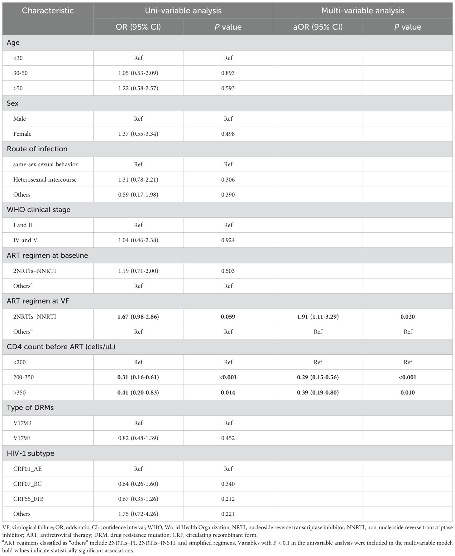 A total of 73 individuals (73/626, 11.7%) in the V179D/E group experienced VF during follow-up. A comparison of the clinical characteristics of patients with and without VF is presented in Supplementary Table S3. Multivariate logistic regression analysis identified the use of 2NRTIs+NNRTI as a risk factor for VF (aOR = 1.91, P = 0.020). The specific NNRTI-based ART regimens used by patients are provided in Supplementary Table S4. Compared to a baseline CD4+ T cell count of <200 cells/μL, baseline CD4+ T cell counts of 200–350 cells/μL (aOR = 0.29, P < 0.001) and >350 cells/μL (aOR = 0.39, P = 0.010) were both significantly associated with a reduced risk of VF. For more detailed information, please refer to Table 3.