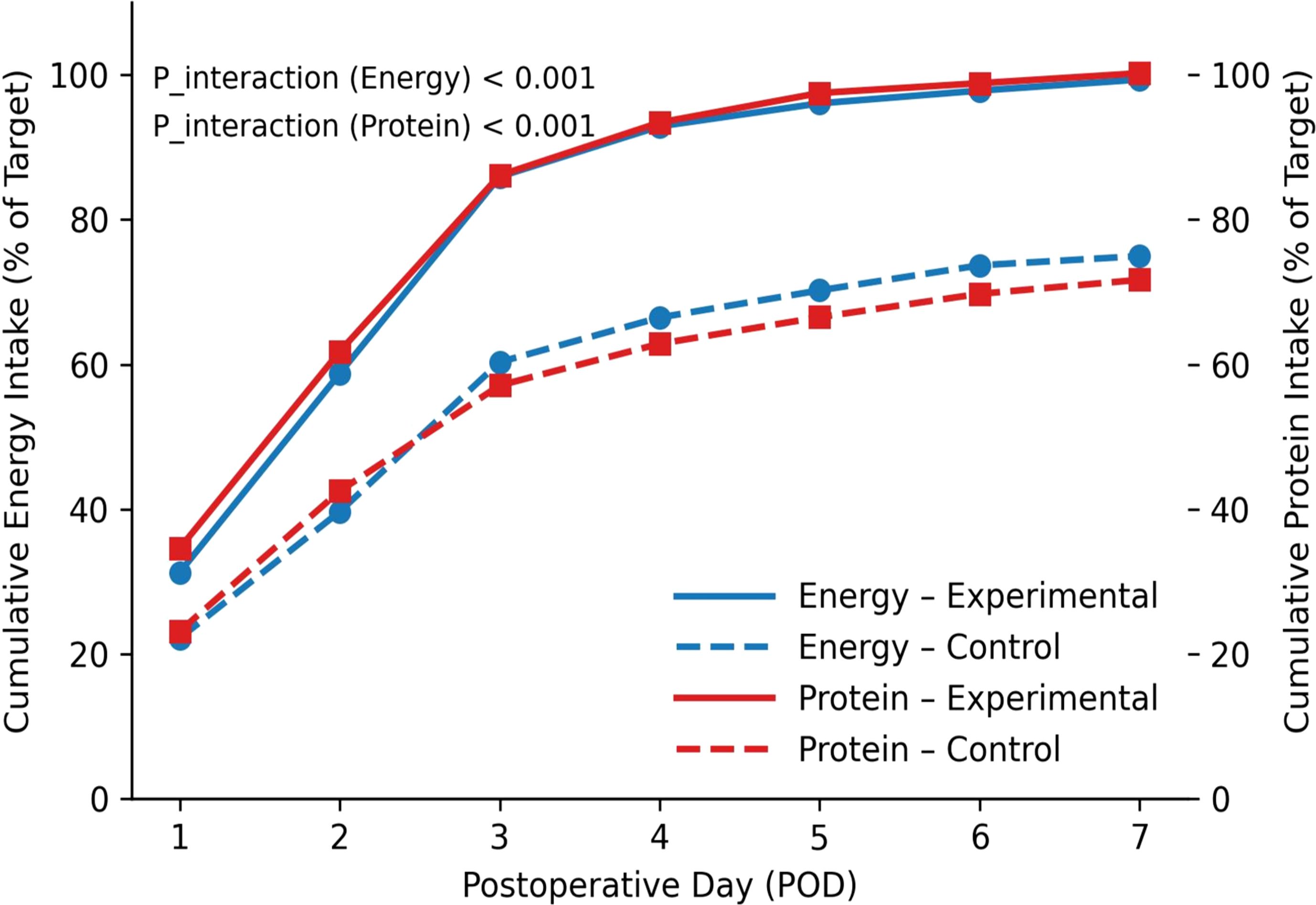 During postoperative days 1–3, the experimental group’s energy and protein intake levels were significantly higher than those of the control group (t test, both P< 0.001). The experimental group also showed markedly better adherence at each ERAS node and for overall pathway adherence (χ² test and t test, both P< 0.001) (Table 2). Within 7 days postoperatively, energy and protein intake increased progressively in both groups, but the cumulative proportion of target achieved was significantly higher in the experimental group than in the control group (group×time interaction in repeated-measures mixed-effects model, both P< 0.001) (Figure 1).