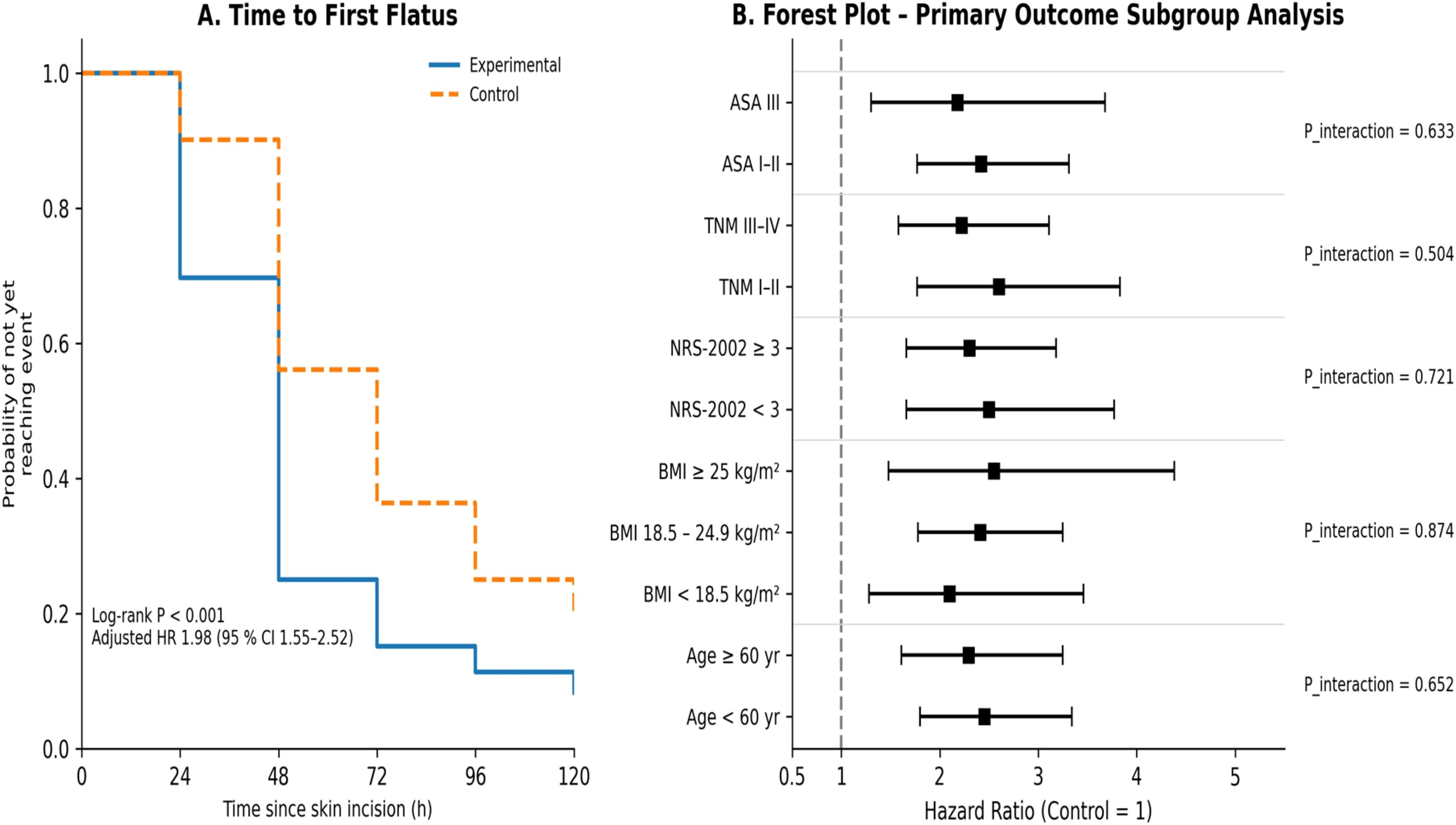 The cumulative incidence of first flatus in the experimental group was significantly higher than that in the control group (log-rank test, P< 0.001). After adjustment for baseline characteristics with the Cox proportional-hazards model, the probability of achieving first flatus was increased by 98% in the experimental group (HR = 1.98 [1.55–2.52]) (Figure 2A). Subgroup analysis showed no significant interactions between treatment effect and factors such as age, BMI, NRS-2002 score, TNM stage, or ASA class (interaction terms in the Cox model, all P_interaction > 0.05) (Figure 2B). Supplementary Table S1 shows the Sensitivity analyses for the primary endpoint (time to first flatus) across key patient subgroups. No significant interaction was observed, indicating robustness of the treatment effect.
