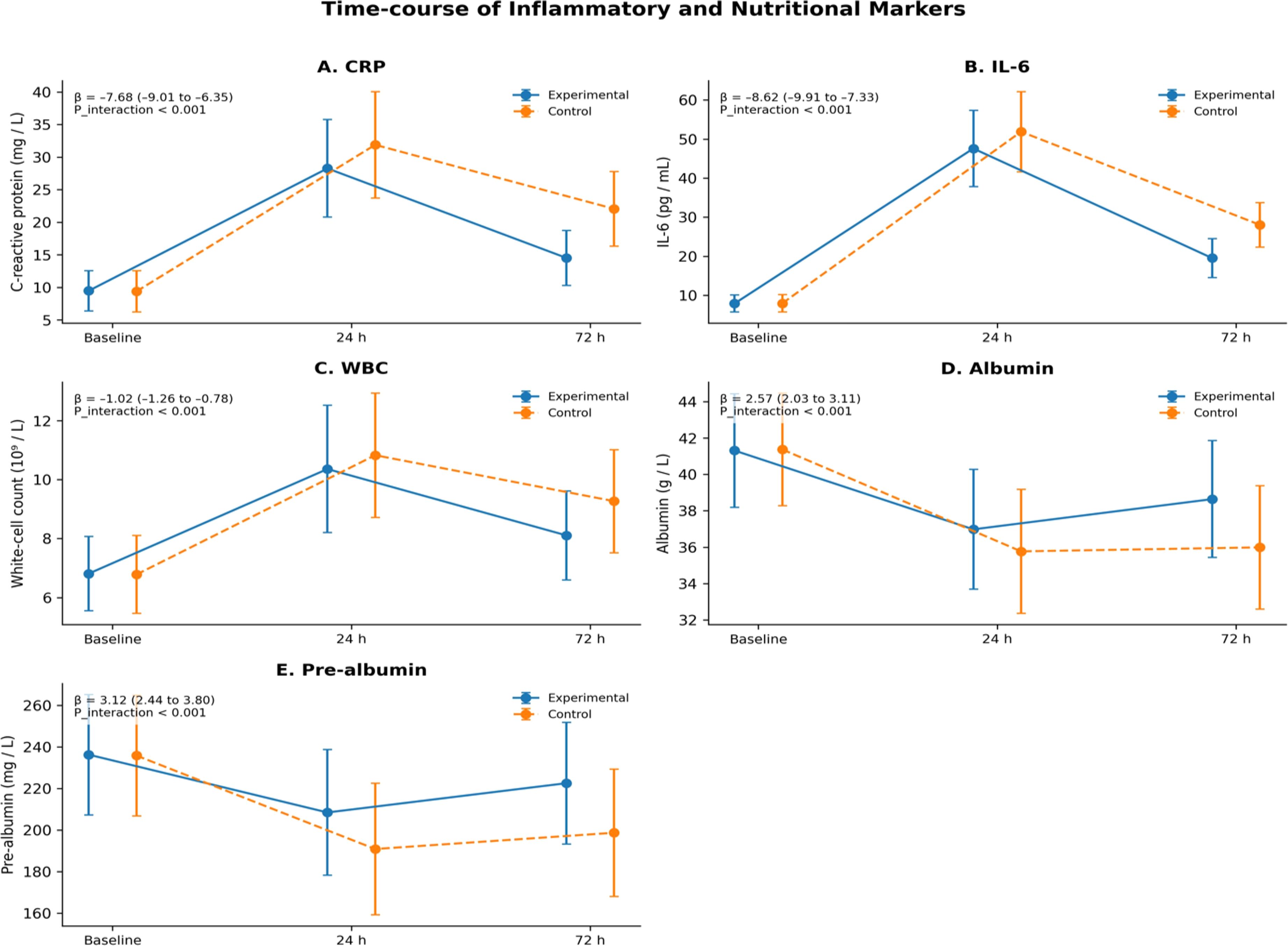 Figure 3. Time-course comparison of inflammatory–nutritional indices. (A) CRP; (B) IL-6; (C) WBC; (D) Albumin; (E) Prealbumin. β represents the estimated coefficient of the “group×time” interaction term in the linear mixed-effects model, and the 95% CI is its confidence interval; P_interaction tests the difference in time trends between groups, two-sided α=0.05.