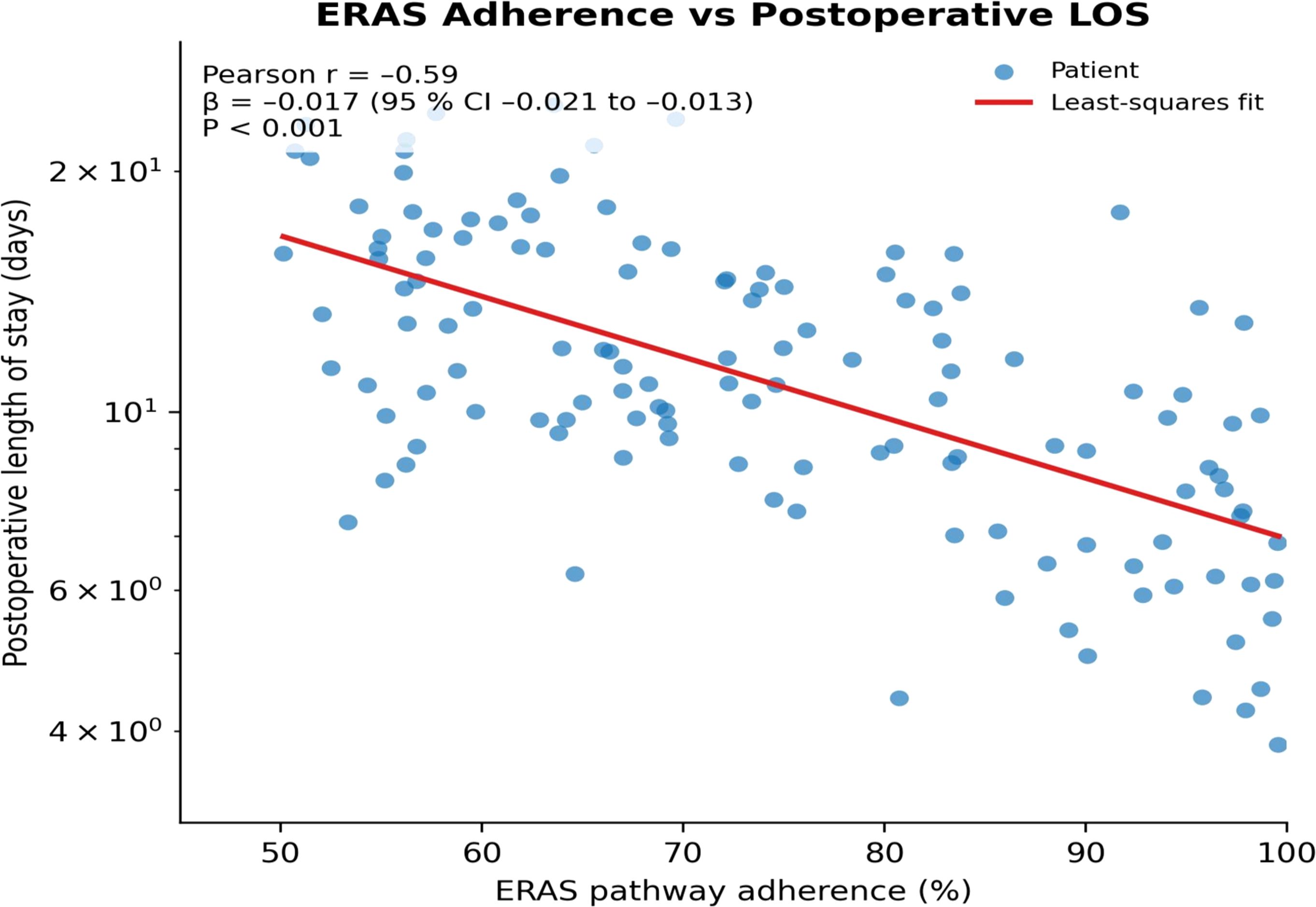 Scatter-plot analysis showed a significant negative correlation between ERAS adherence and postoperative length of stay (r = –0.59; β = –0.017, 95% CI –0.021 to –0.013; P<0.001); each 1% increase in adherence shortened hospital stay by an average of about 1.7%, further confirming that high adherence saves inpatient resources and reduces overall costs (Figure 4). Conceptual framework for synergy between probiotics, enteral nutrition, and ERAS is given in Figure 5.