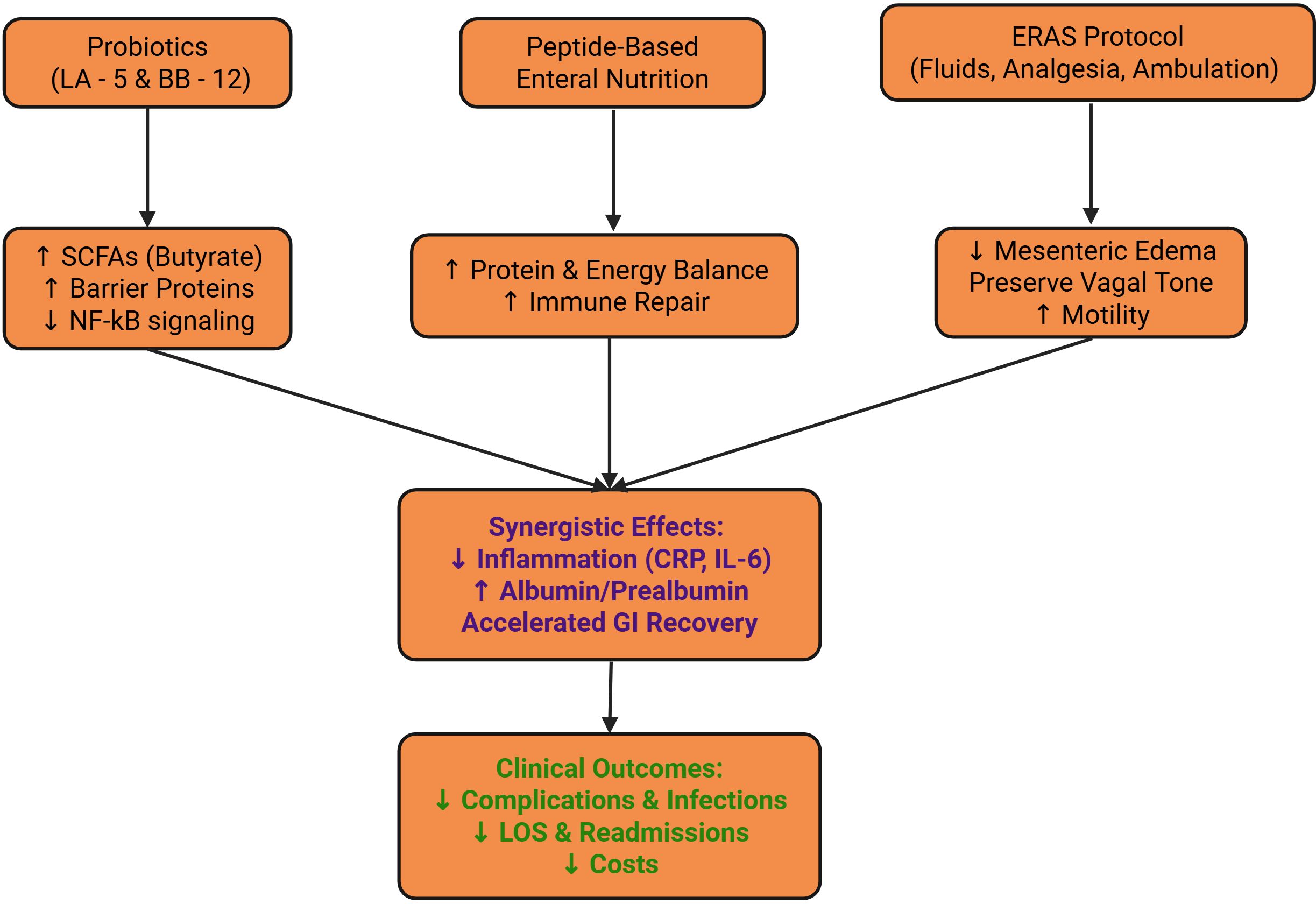 Figure 5. Biological and clinical mechanisms by which probiotics, peptide-based enteral nutrition, and ERAS synergize to promote recovery in laryngeal cancer patients.