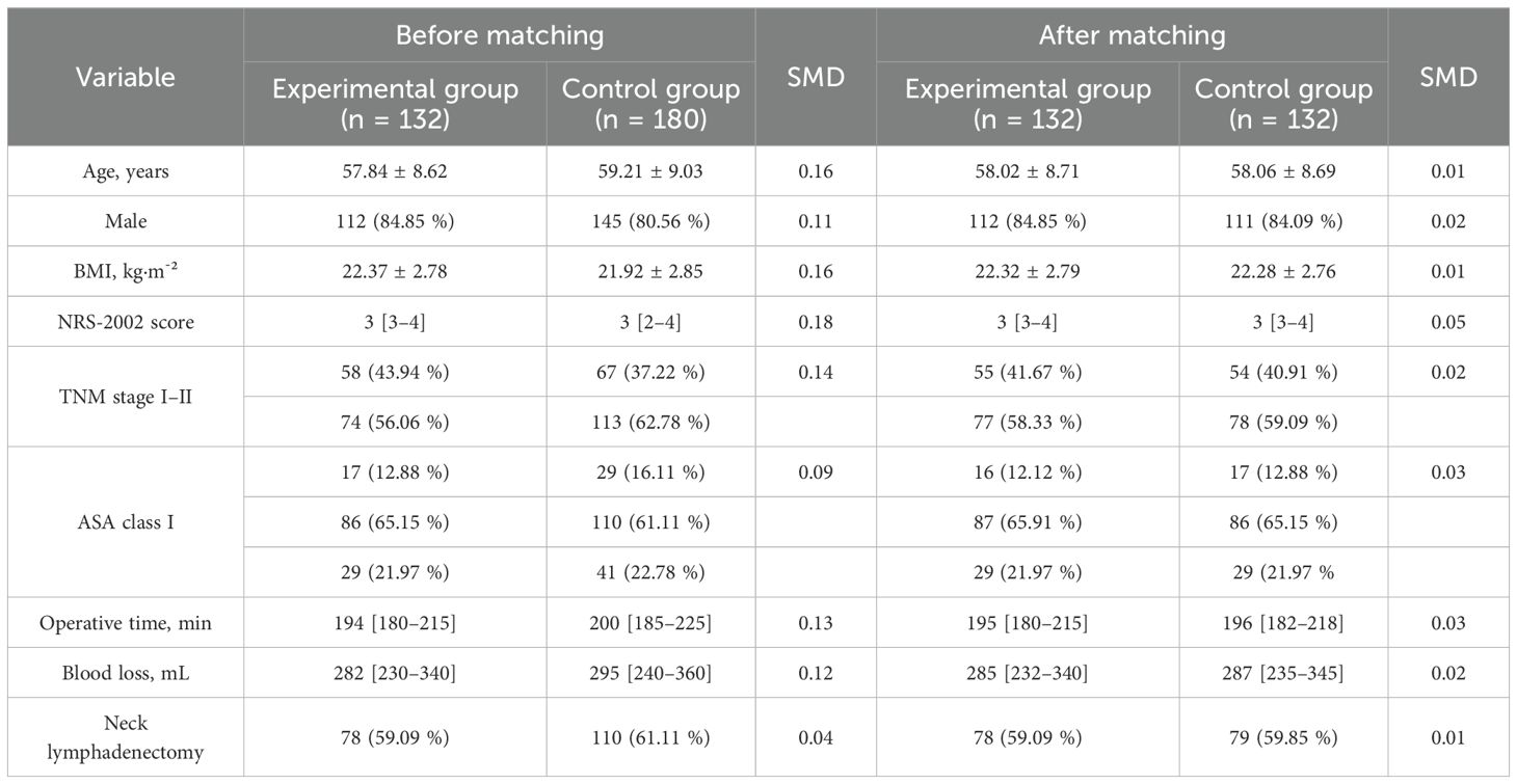 After 1:1 nearest-neighbor propensity-score matching, baseline characteristics—including age, sex, BMI, NRS-2002 score, TNM stage, ASA class, operative time, blood loss, and the proportion undergoing neck lymphadenectomy—were well balanced between the two groups (all standardized mean differences SMD< 0.10) (Table 1).