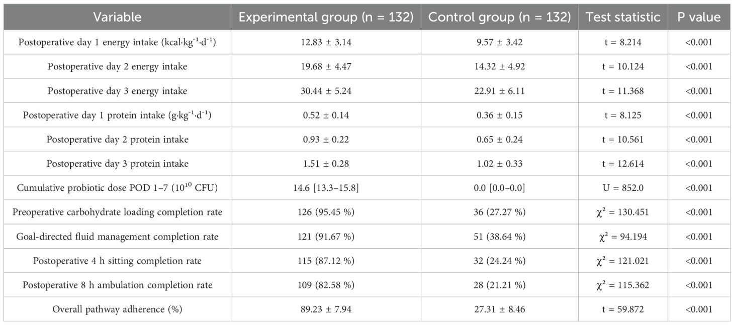 Baseline variables included sex, age, BMI, NRS-2002 score, tumor TNM stage (AJCC 8th), number of comorbidities, and ASA classification. Surgery-related variables comprised anesthesia duration, operative time, blood loss, and whether simultaneous neck lymphadenectomy was performed. Intervention implementation was quantified by daily energy intake, protein intake, total probiotic CFU, and ERAS adherence rate. The primary endpoint was time to first flatus (in hours). Secondary endpoints included absolute values and changes from baseline of C-reactive protein (mg·L-¹), leukocyte count (109·L-¹), albumin (g·L-¹), prealbumin (mg·L-¹), and IL-6 (pg·mL-¹) at 24 h and 72 h postoperatively; Clavien-Dindo complication grade (I–V, grade ≥ II defined as clinically meaningful complications) (Alci et al., 2025); hospital infection incidence determined according to the “Hospital Infection Surveillance Standard WS/T 312—2023” (Wang et al., 2025); duration of antibiotic use (days), postoperative length of stay (days), direct hospitalization costs (RMB), and 30-day readmission rate.