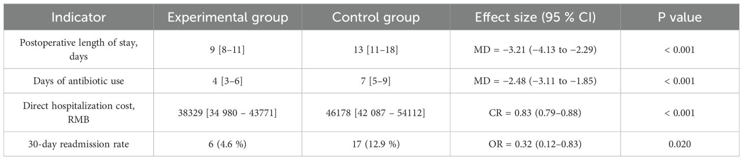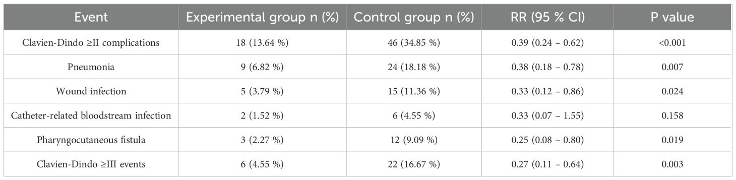 Postoperative risks of Clavien-Dindo grade ≥II complications, pneumonia, wound infection, pharyngocutaneous fistula, and Clavien-Dindo grade ≥III events were all significantly lower in the experimental group than in the control group (robust-variance Poisson regression, RR range 0.25–0.39, all P<0.05); the difference in catheter-related bloodstream infection between groups was not significant (P = 0.158) (Table 3). Log-transformed linear regression, Gamma-GLM, and logistic regression showed that postoperative length of stay, days of antibiotic use, and direct hospitalization costs were significantly lower in the experimental group than in the control group (all P<0.001), and the 30-day readmission risk was also significantly reduced (P = 0.020) (Table 4).