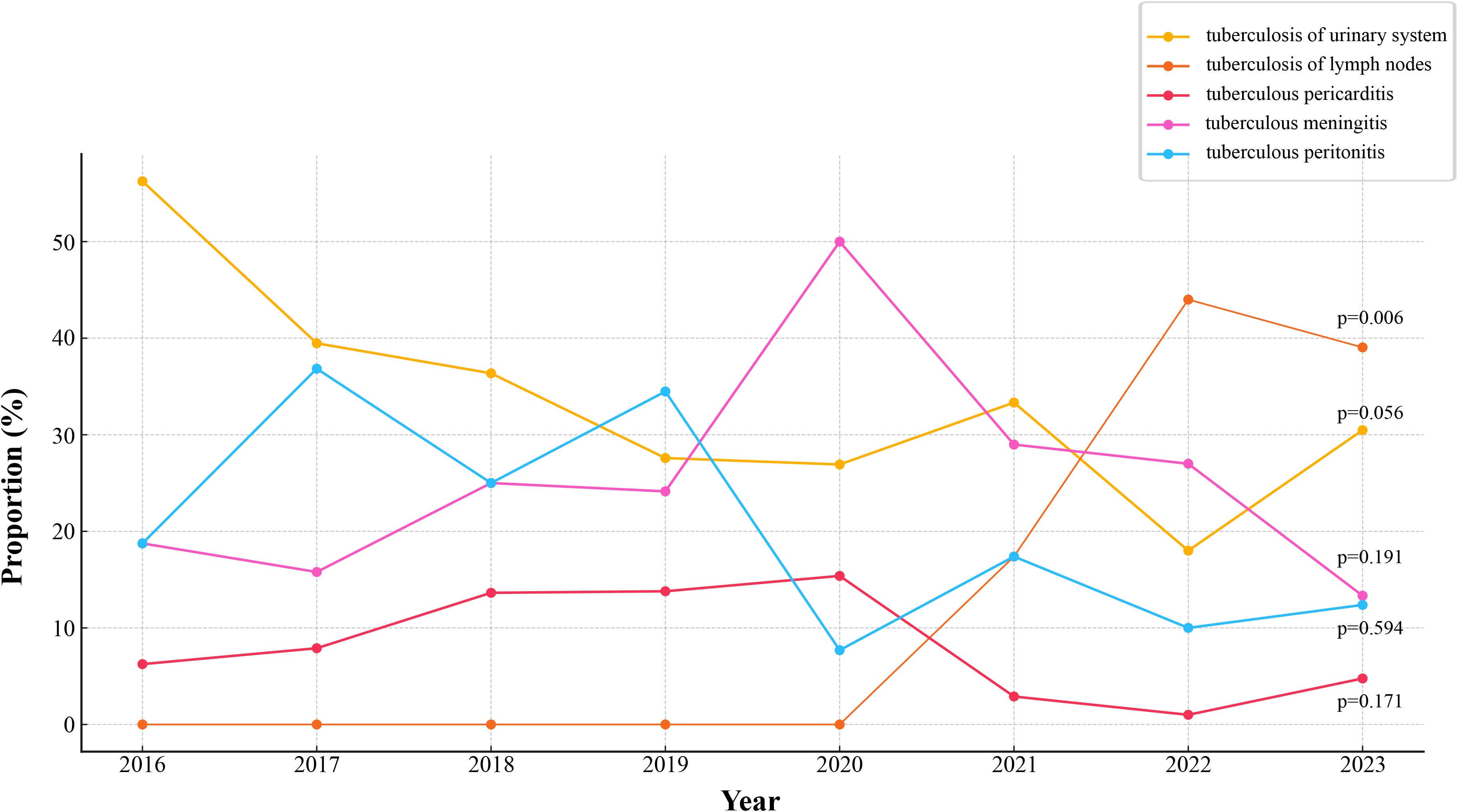 Figure 1. Trends in proportions of different types of EPTB. The temporal changes in the proportions of various forms of EPTB. p-values is annotated for key trends.