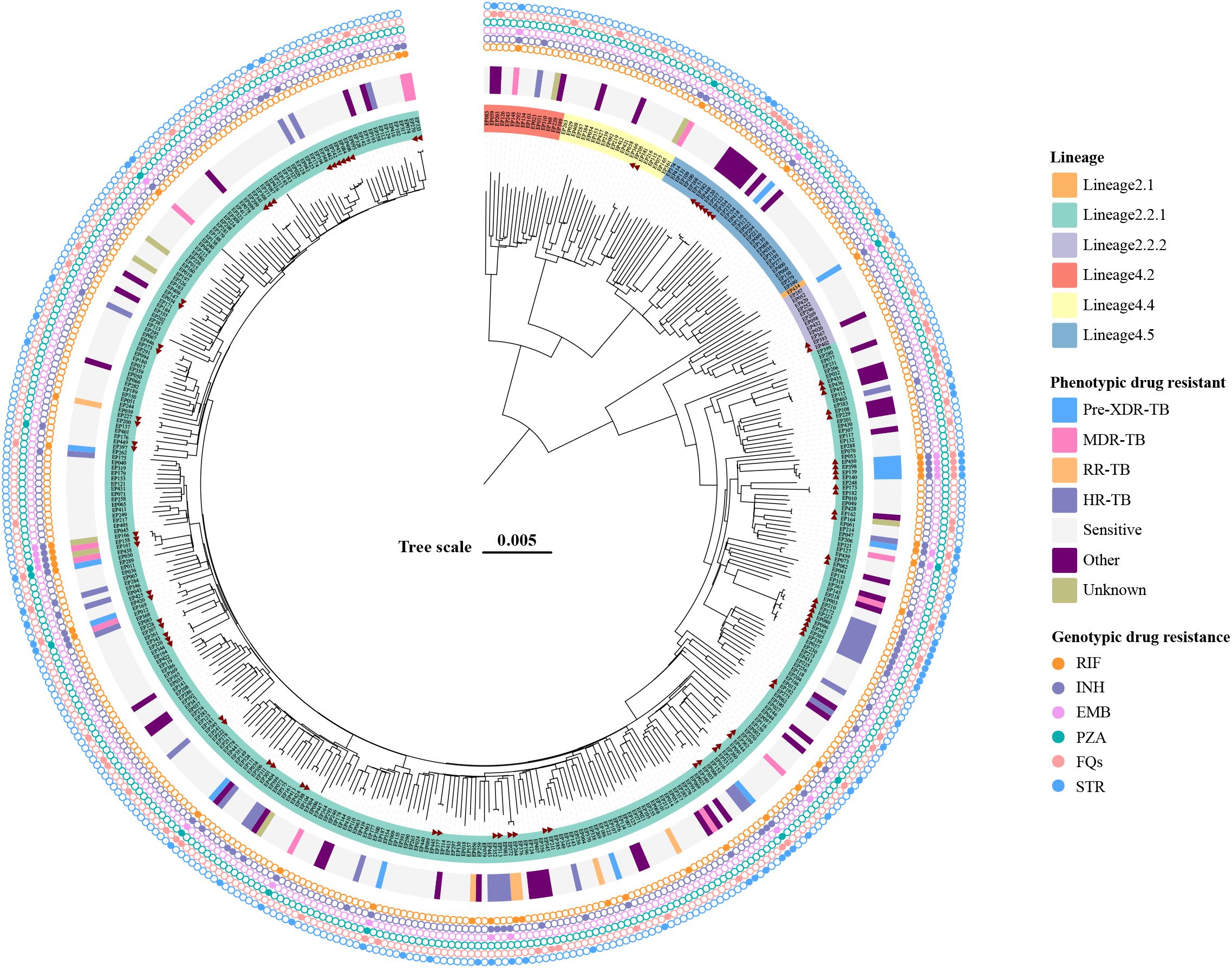 Figure 2. Maximum-likelihood tree of 427 EPTB strains and annotated with drug-resistant information. Lineages, phenotypic drug-resistant type, and genotypic drug-resistant profile of strains are shown. The potential transmission clusters defined by no more than 12 SNPs are indicated in red triangle. Scale bar indicates the genetic distance proportional to the total number of single nucleotide polymorphisms.