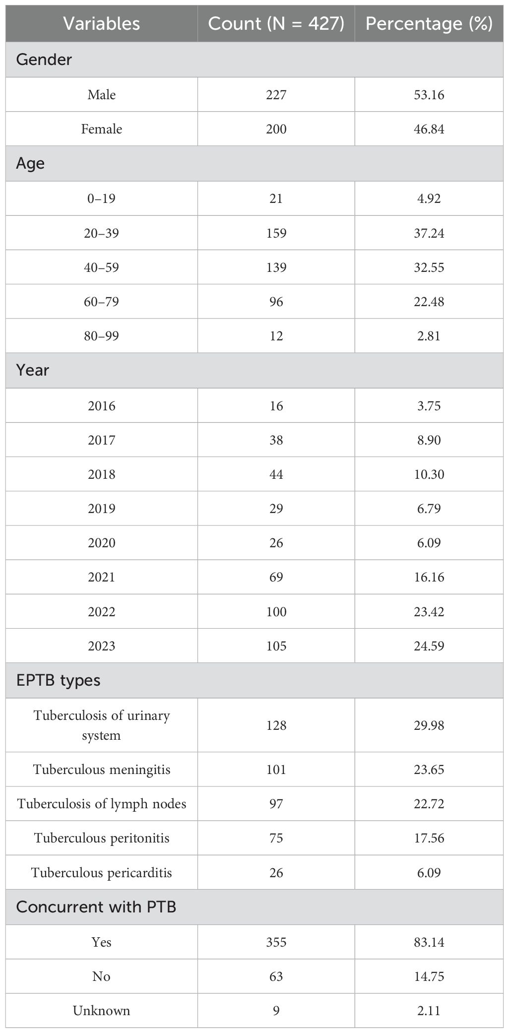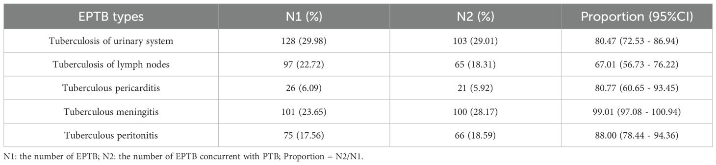 Tuberculosis of urinary system (29.98%) was the most common EPTB type in this study, followed by tuberculous meningitis (23.65%) and tuberculosis of lymph nodes (22.72%) (Supplementary Figure S1). Tuberculous pericarditis was the least common, representing only 6.09% of cases. Of the 427 patients, 355 (83.14%) had concurrent pulmonary tuberculosis (PTB), while 14.75% had EPTB alone (Table 1). Figure 1 illustrates the trend in the distribution of different types of EPTB over the study period (2016–2023). The average proportion of tuberculosis of urinary system was 33.55%, which was the highest diagnosis type. Tuberculosis of lymph nodes showed a marked increase from 2020 to 2022. The proportions of tuberculous meningitis and tuberculous peritonitis fluctuated significantly across different years. Quadratic non-linear regression analysis indicated a significant increase in the proportion of lymph node tuberculosis, whereas tuberculosis of urinary system exhibited a clear decreasing trend (Supplementary Table S2). Table 2 presents the occurrence of different types of EPTB concurrent with PTB. The association between different types of EPTB and PTB was significant. Tuberculous meningitis had the highest PTB concurrence rate at 99.01%, indicating that nearly all meningitis patients also had PTB. Tuberculosis of lymph nodes had the lowest PTB concurrence rate, at only 67.01%. The PTB concurrence rate for pericarditis was 80.77%, slightly lower than that of meningitis and peritonitis. However, its confidence interval was relatively wide (60.65%-93.45%), likely due to the small sample size (26 cases).