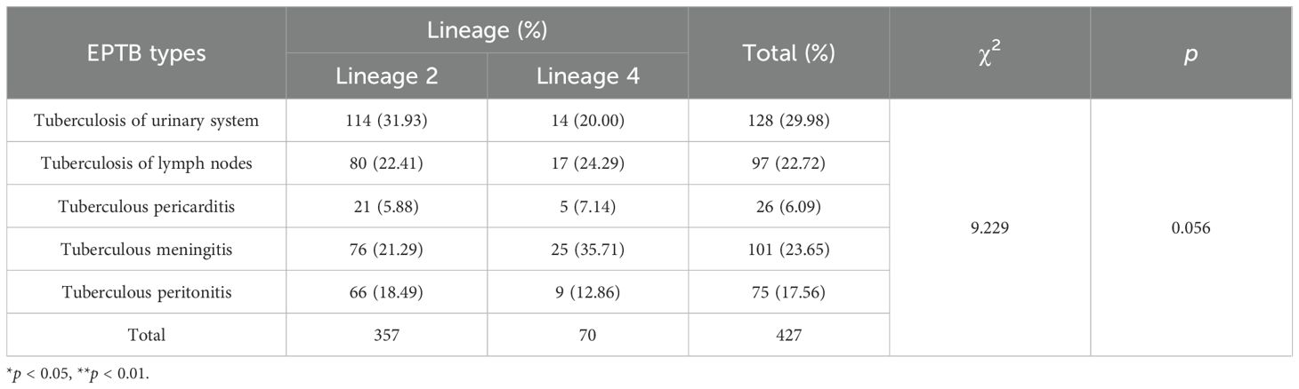 This study analyzes the whole-genome sequences of 427 EPTB strains and identifies two main lineages: lineage 2 (83.60%) and lineage 4 (16.39%). In the epidemiological context of East Asia, the stronger pathogenicity and adaptability of lineage 2 enables it to remain dominant in EPTB infections (Gagneux, 2018). The proportion of lineage 4 in tuberculous meningitis is higher (35.71%), but this preference is not significant. It has been suggested that intra-lineage diversity may drive differences in immune responses, leading to different clinical phenotypes of TB (Thwaites et al., 2008; Negrete-Paz et al., 2021). Research analysis demonstrates that the strains belonging to the Indo-Oceanic lineage are significantly correlated with infections of the central nervous system. Meanwhile, strains of the East Asian lineage are significantly associated with infections of bones and joints as well as with PTB infections (Negrete-Paz et al., 2021).