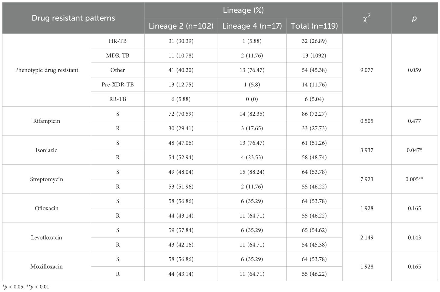 According to the latest definition of drug-resistant TB, 1.41% (6/427) isolates were RR-TB (rifampicin-resistant tuberculosis), 3.04% (13/427) isolates were MDR-TB and 3.28% (14/427) were Pre-XDR (pre-extensively drug-resistant), and 7.49% (32/427) and 17.10% (73/427) isolates belonged to HR-TB (isoniazid-resistant tuberculosis) and other types, respectively (Figure 2). Table 4 summarizes the association between M. tuberculosis lineages and DR. There was no significant difference in the distribution of different resistance patterns across lineages (p = 0.159). Of note, lineage 2 was more prone to developing resistance to STR and INH (p < 0.05) in single-drug resistance cases.
