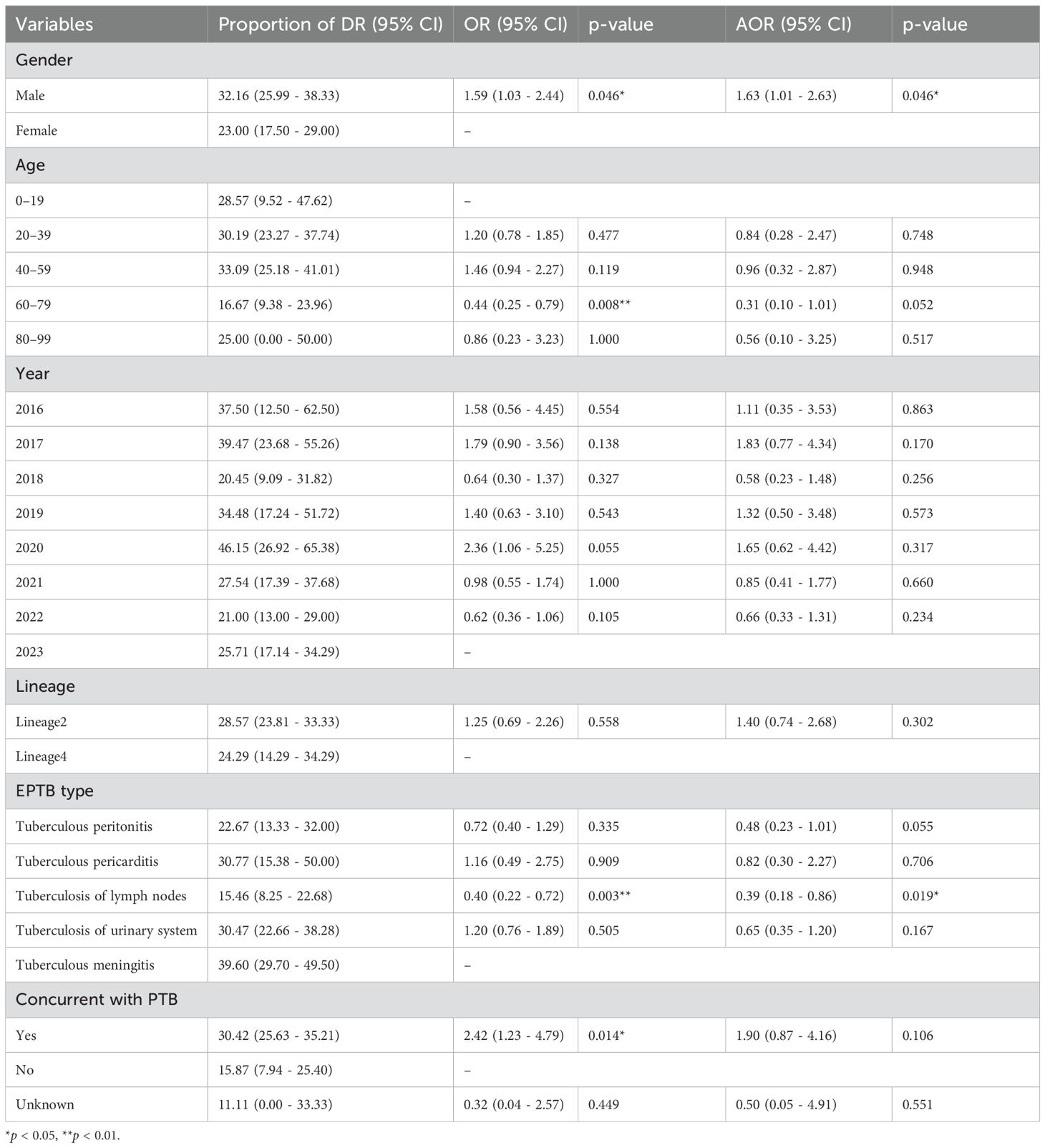 The study also identifies several factors significantly associated with DR-TB. Males have a significantly higher risk of DR compared to females (aOR = 1.63, 95% CI: 1.01-2.63, p = 0.046). The DR rate peaks in 2020 (46.15%) and decreases in 2023 (25.71%), though these fluctuations are not statistically significant. Variations in TB control strategies from year to year, as well as external factors such as the COVID-19 pandemic, may influence these trends. The study period (2016–2023) overlaps with the COVID-19 pandemic, which has significant impacts on TB diagnosis, case reporting, and treatment delivery worldwide (Falzon et al., 2023). As shown in Supplementary Table S1, the number of isolates decreases during the early pandemic period (2020) and gradually increases in the following years, reflecting the temporary disruption and subsequent recovery of TB control services. Coexistence of PTB and EPTB is associated with an elevated risk of DR-TB, which aligns with findings from other studies suggesting that co-infection leads to higher DR rates than when PTB is present alone (Boonsarngsuk et al., 2018). Other studies have reported that patients with drug-resistant TB have a worse prognosis than patients with pulmonary drug-resistant TB and extrapulmonary drug-sensitive TB (Christensen et al., 2014). The study does not include detailed clinical data regarding the treatment status of pulmonary TB patients. Since prior exposure to anti-TB drugs can significantly influence the development of resistance, the absence of this information may affect the interpretation of our susceptibility results. Nonetheless, the results underscore the need for continued focus on high-risk populations and improved strategies for early diagnosis, personalized treatment, and the optimization of TB control measures.