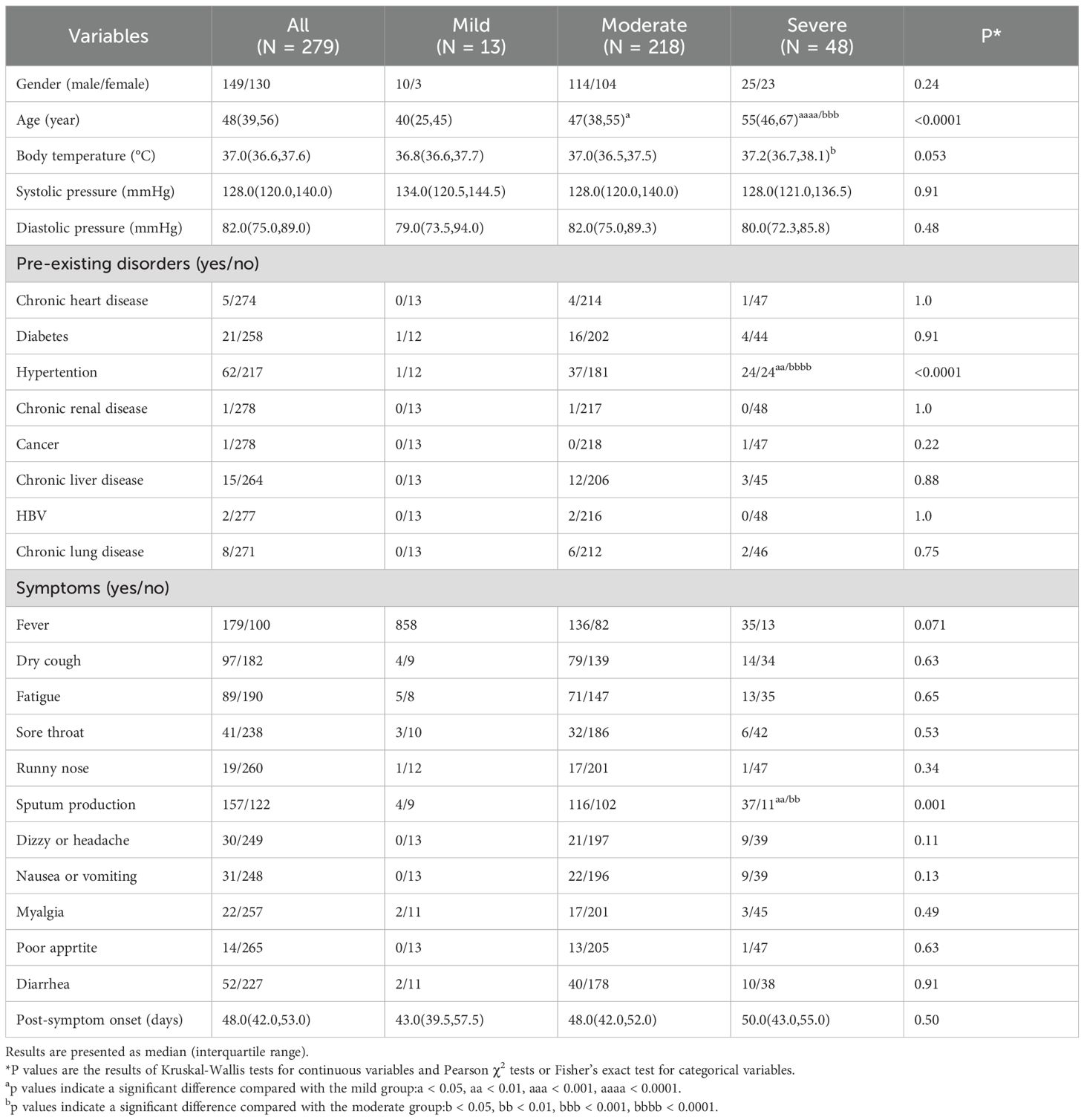 The study cohort comprised 279 patients (149 males, 130 females) with a median age of 48 years (interquartile range [IQR] 39–56). Age exhibited a significant association with disease severity (p<0.0001), with severe illness primarily observed in older adults (median age: 55 years). Comorbidity prevalence was notable in 41.2% of participants (n=115), dominated by hypertension (22.2%), followed by diabetes (7.5%) and chronic liver disease (5.4%). Of note, comorbidity profiles and treatment regimens were balanced across severity groups and did not differ significantly between patients with and without lymphopenia. Patients were stratified into mild, moderate, and severe severity groups and followed for a median of 50 days post-symptom onset (IQR 48 days; range 42–53 days). Full demographic and clinical details are summarized in Table 1.